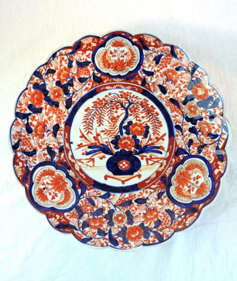 A large Japanese 19th century Imari charger with a hand painted exterior and interior of a stunning floral design and pattern in orange and blue on white porcelain. The piece has soft petal waves around the edges, giving it a unique flower shape. It is beautifully decorated with a lovely bonsai tree in the centre, with blossoming flowers, leaves and buds.