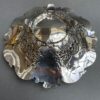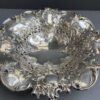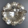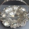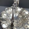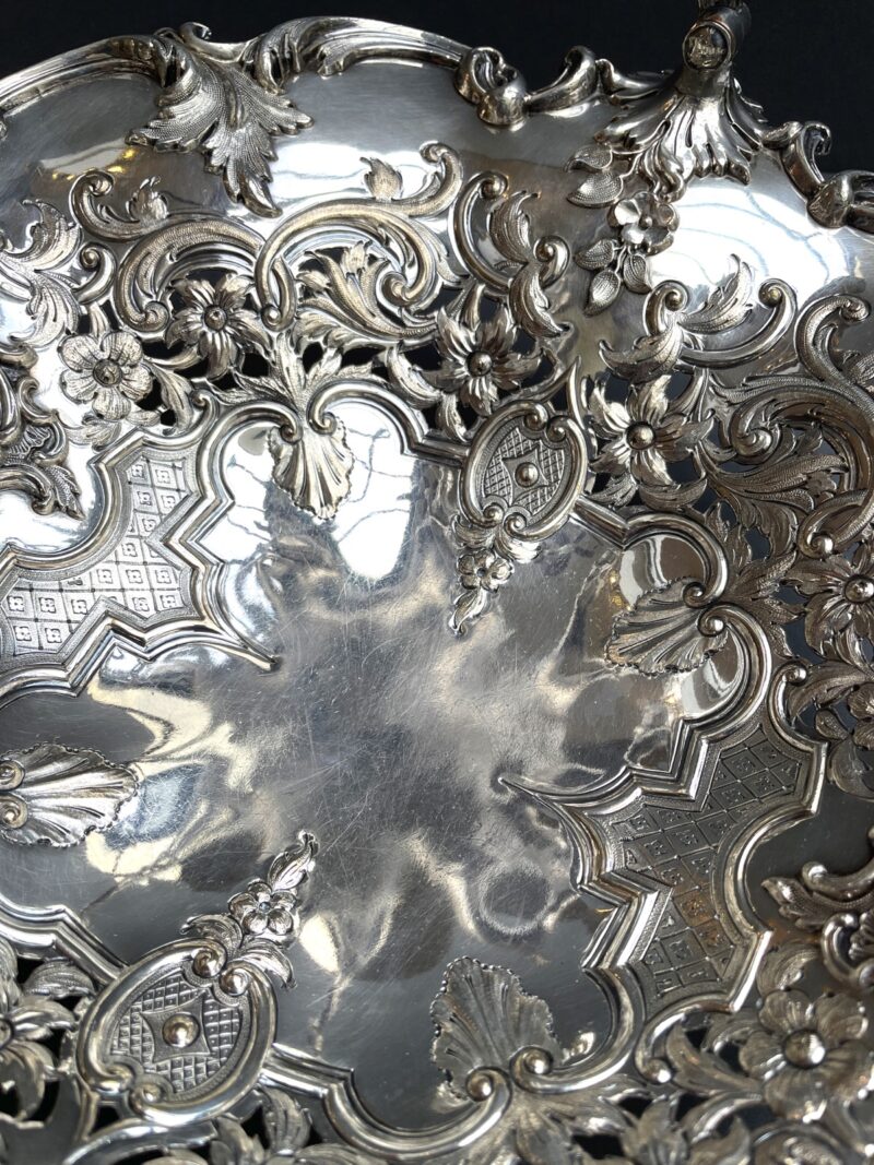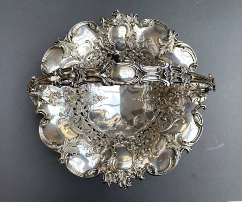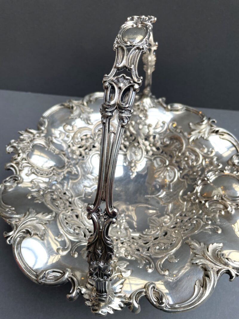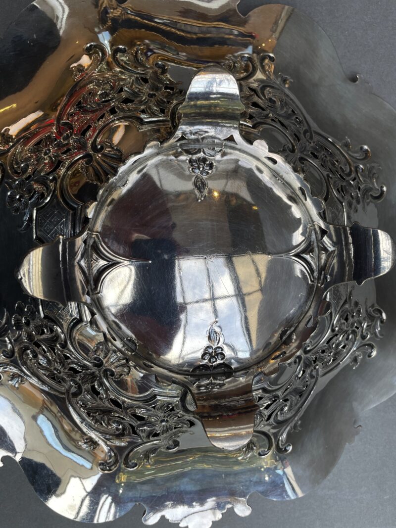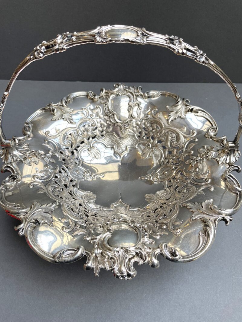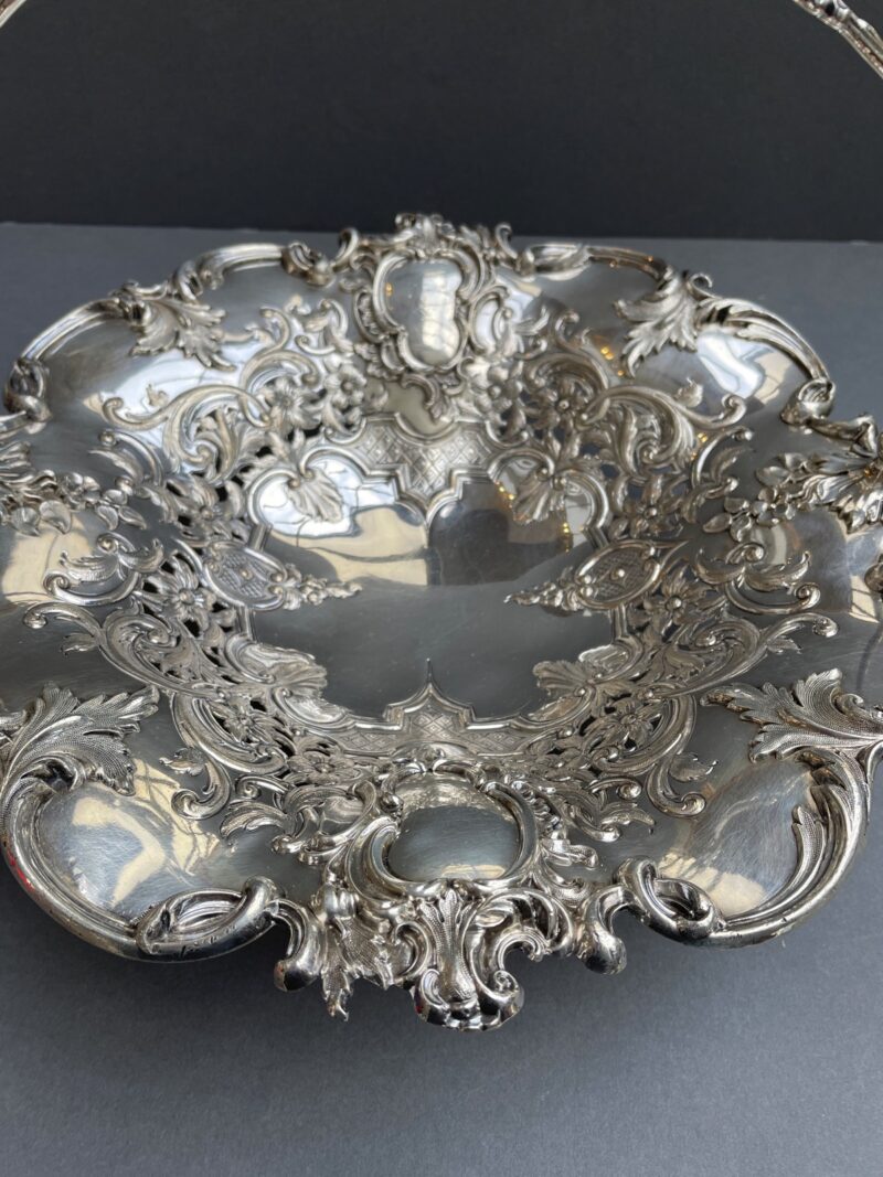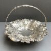 A nice quality large brides basket with hinged handle.  The body is fluted in shape and has piercing throughout the floral & scroll designs on the surface of the basket.  It sits on 4 feet.