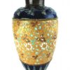A large Royal Doulton Lambeth vase, it dates circa 1890. Decorated in the beautiful art nouveau style, it has a unique design consisting of vine, leaf, bead, bud and floral on the exterior. The base colour is a deep blue, with gold, brown, green, ivory and teal with a high gloss. The design is the right balance of simplicity and elegance, with a lovely bulbous shape and round foot for support.