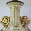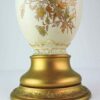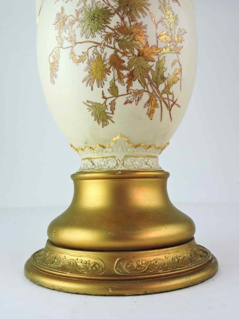 This large English Royal Worcester lamp dates circa 1890, it is a simple yet elegant porcelain lamp in the classic style of  Royal Worcester. It has a soft creamy colour for the body expertly adorned with delicate golden chrysanthemums on both the front and back, featuring decorative floral shapes accents with gold around the bottom and top trim. Raised on a gilt plinth to add height to this outstanding lamp to perfectly brighten up any space.