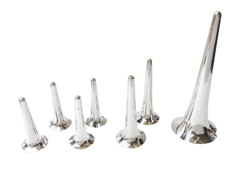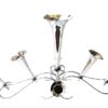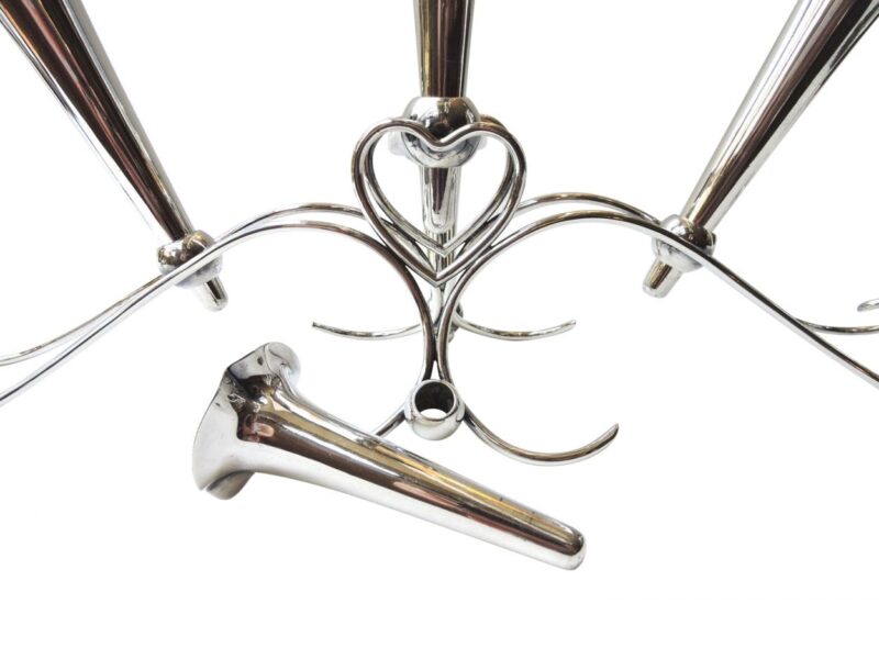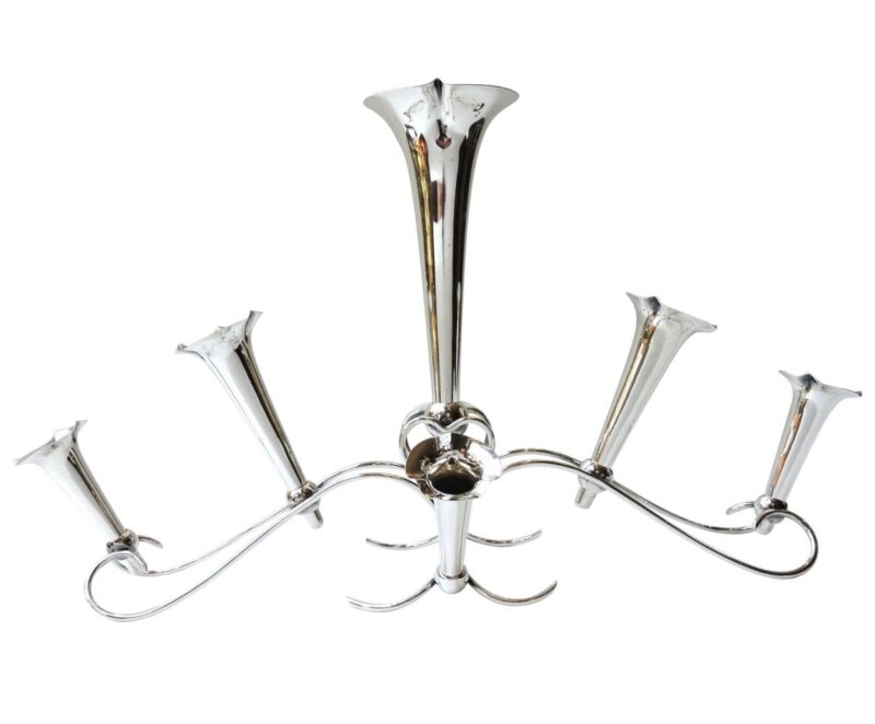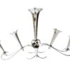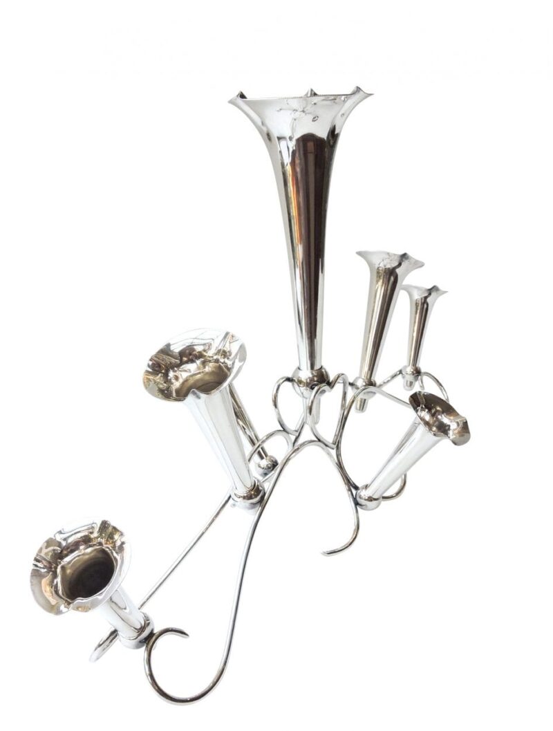 A gorgeous silver-plated epergne with 7 trumpets for holding flowers.