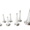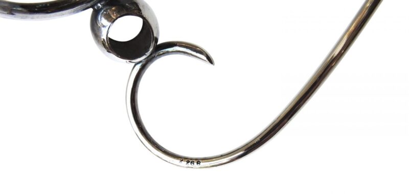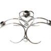 Seven blossom trumpets are held aloft by a simple silver plated, scrolling metal frame with a heart motif.