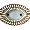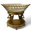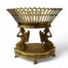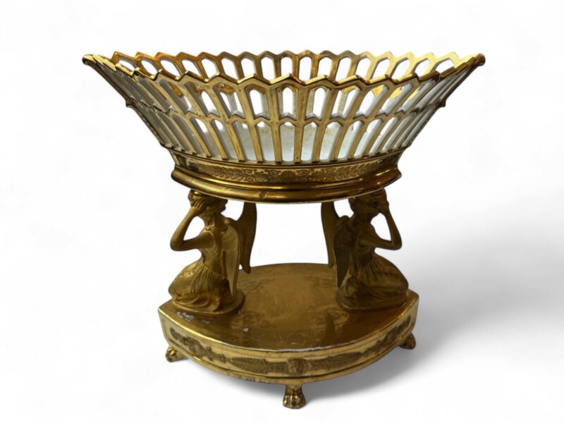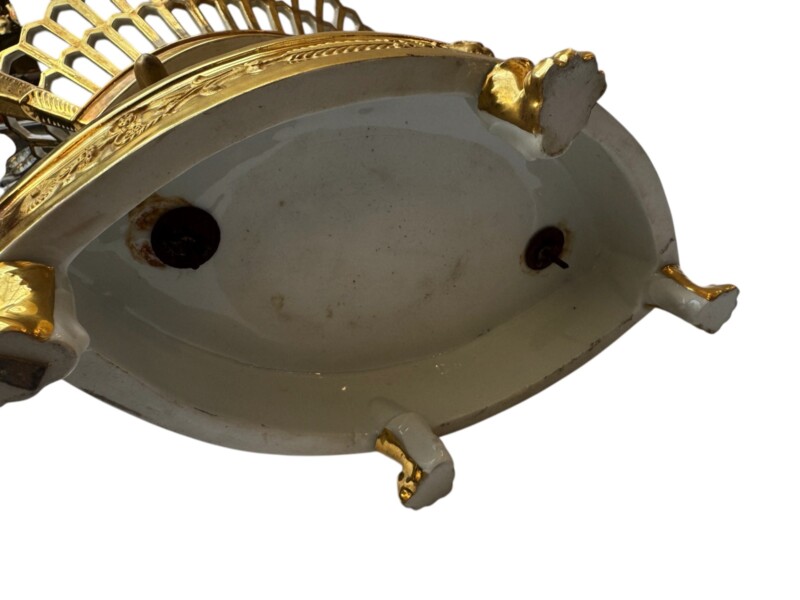 Large and stately Paris porcelain gilt “navette shaped” basket in white openwork porcelain inside and gold gilt on the outside. The “open weave” gilt basket is resting on 2 kneeling angels in the “neoclassical style” on a base of the same shape and standing on “claw feet”. The oblong gilt base is decorated on both sides with a border of neoclassical motifs.