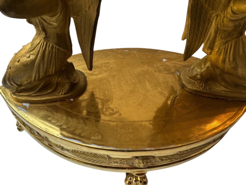 There is a restoration of one of the angel’s wings and the gold is slightly worn consistent with the age and use especially on the base. Otherwise is in good condition.