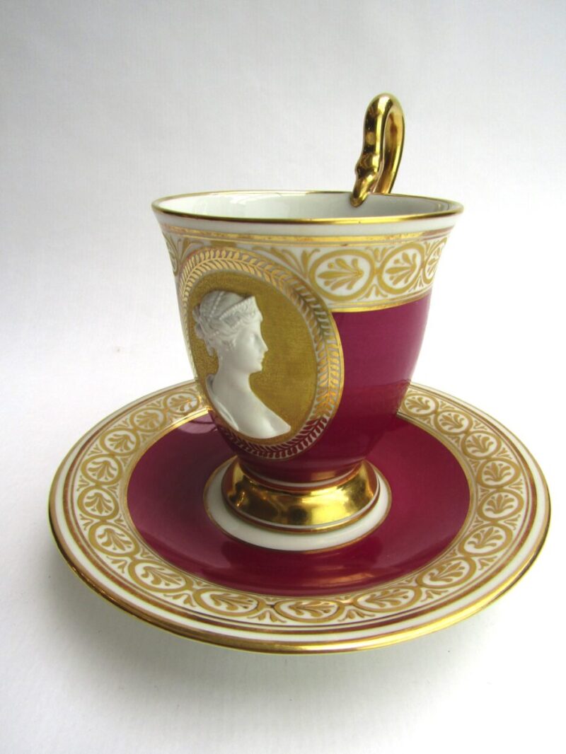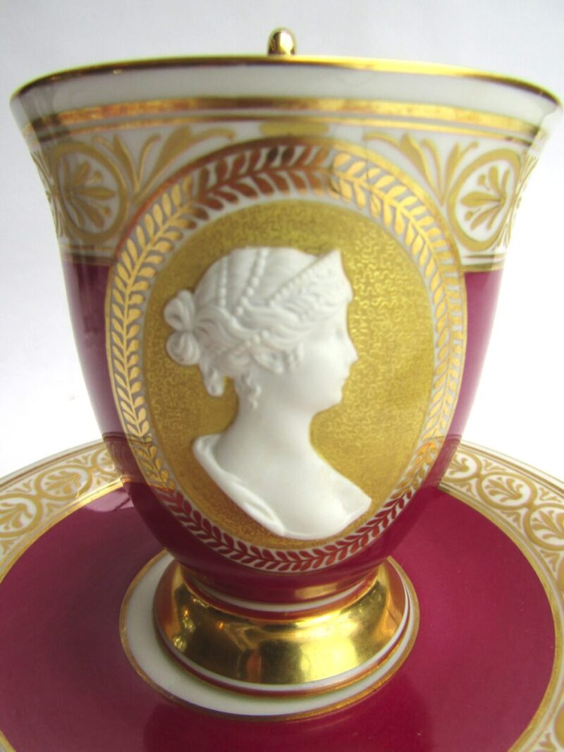 Late 19th Century Berlin KPM Porcelain Cameo Portrait Cup & Saucer, Burgundy & Gold