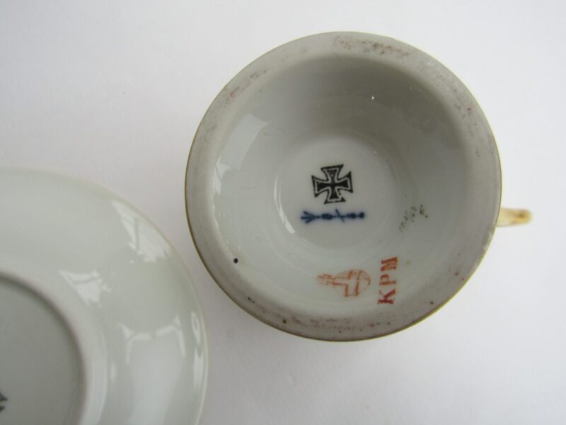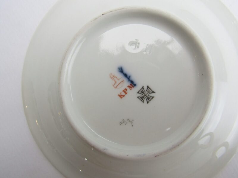 On the underside is the  KPM ‘Orb Mark’ in red along with the underglaze blue ‘Scepter Mark’.  In addition there is a German black Iron Cross mark and “125 / 63 F”
