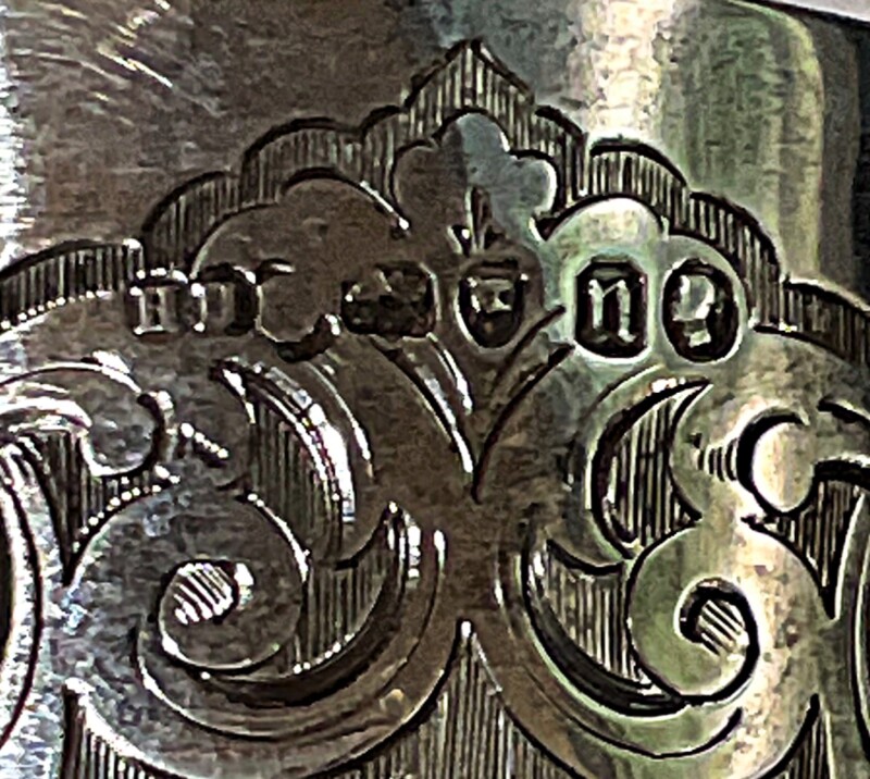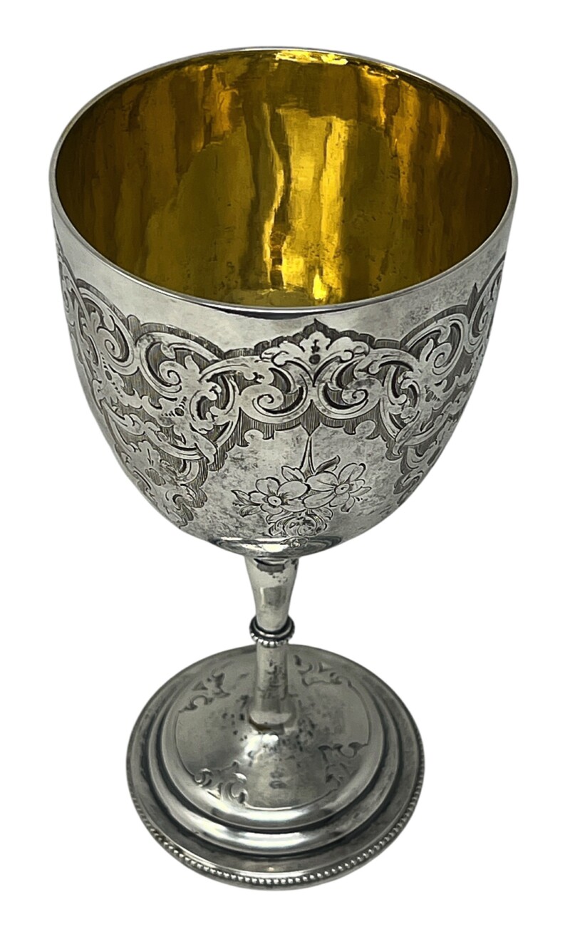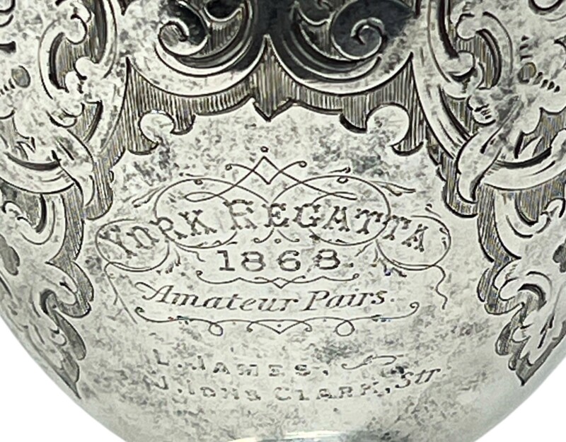 v** SOLD ARCHIVES **vA late Victorian sterling silver trophy cup, with hallmarks “HH for Henry Holland” , “n for 1868” and detailed “by hand engraving” of scroll and foliate work around the entire circumference and showing a gorgeous gold gilt interior in excellent condition. Lovely turned stem and round base with engraving and silver beaded edge. Inscription reads: “YORK REGATTA 1868 Amateur Pairs” “L. James, J. Ions Clark”. The opposite side of the cup has a vacant cartouche awaiting your personal engraving.
