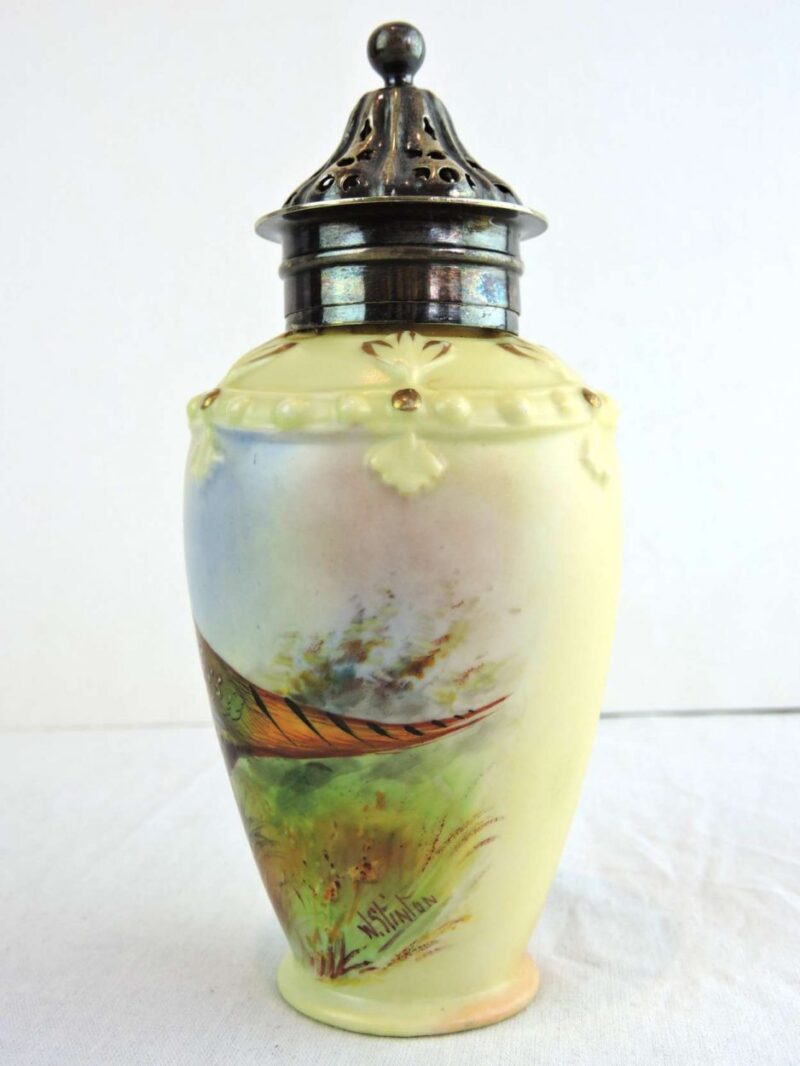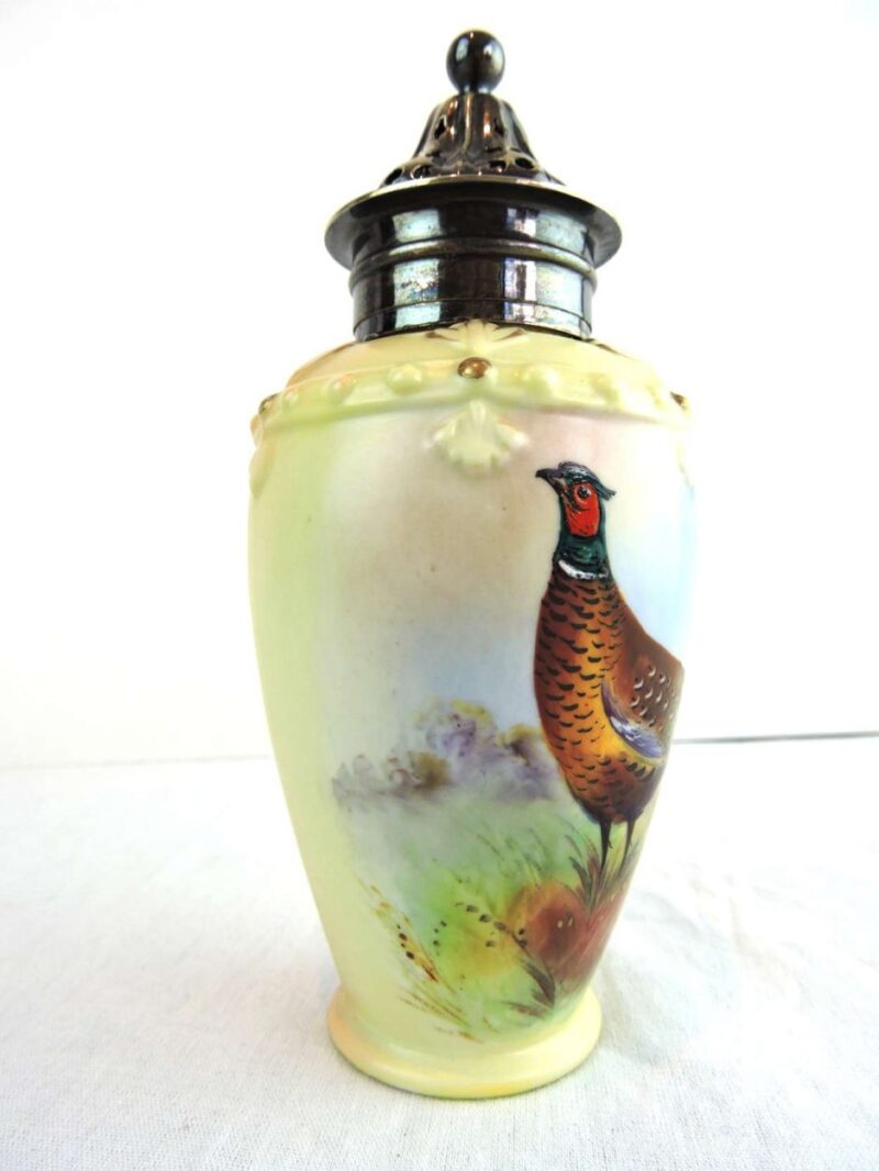 PorcelainsA lovely hand painted Locke & Co. Worcester shaker with a painted colourful Pheasant bird on the front. The painting was done by Walter Stinton from the famous Stinton family of Worcester painters.