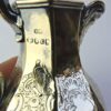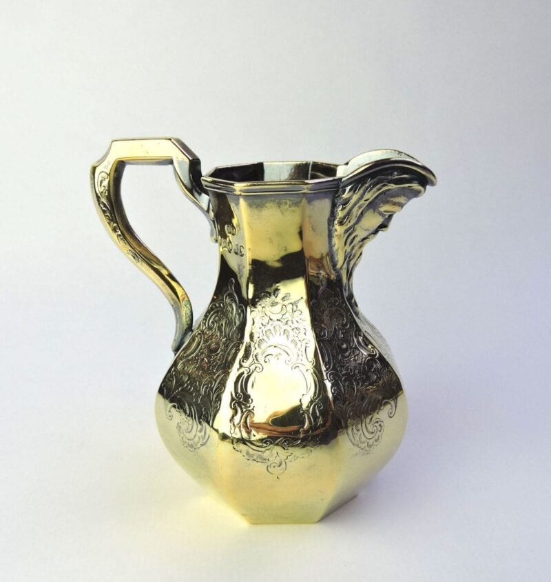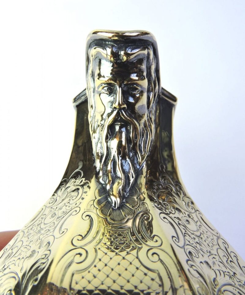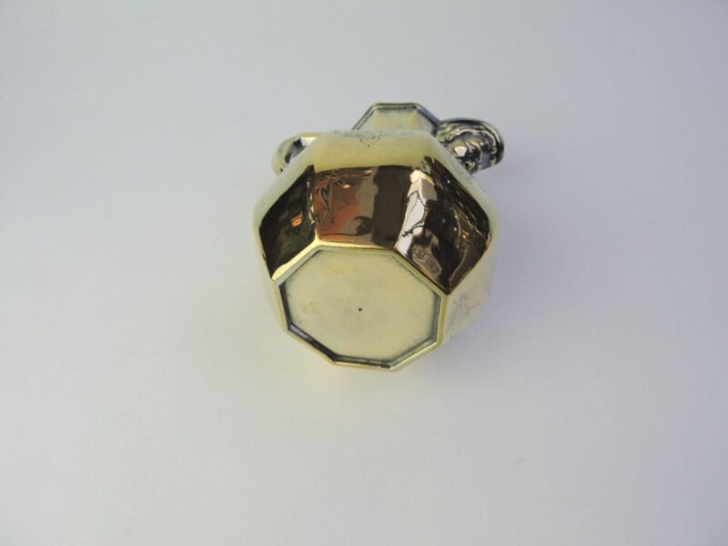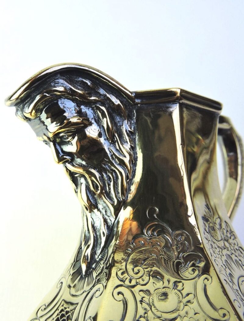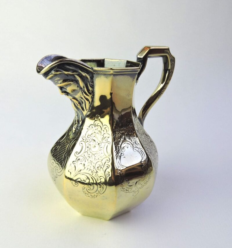 This is an unique English hallmarked sterling silver gilt cream jug, dated 1846. This jug featuresĀ an old man’s face with a long beard on the spout of the jug and elaborate scroll & floral engravings on the 8 sides of its octagonal shape.