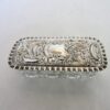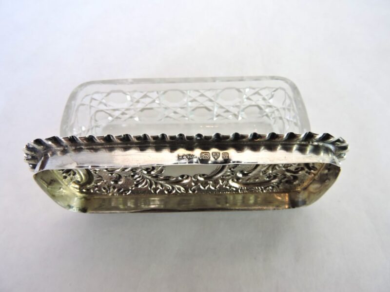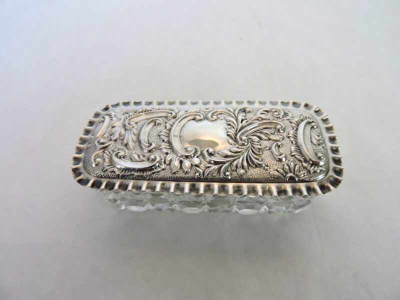 A very pretty sterling silver (hallmarked London England) and cut crystal oblong covered trinket box. The box lid has a scalloped rim and wonderfully embossed decoration in the silver. Please see the second photo for details of the hallmarks. The box measures 4 inches wide X 1/2 inches long X 1 3/4 inches tall and is in excellent condition.