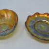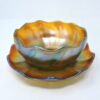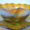 A gorgeous Tiffany glass Favrile finger bowl with matching under plate, circa 1900. Both signed “L.C.T.” (for Louis Comfort Tiffany) and “Favrile” on the underside of the bowl and plate.  Both the bowl and plate have scalloped edges.