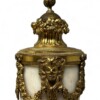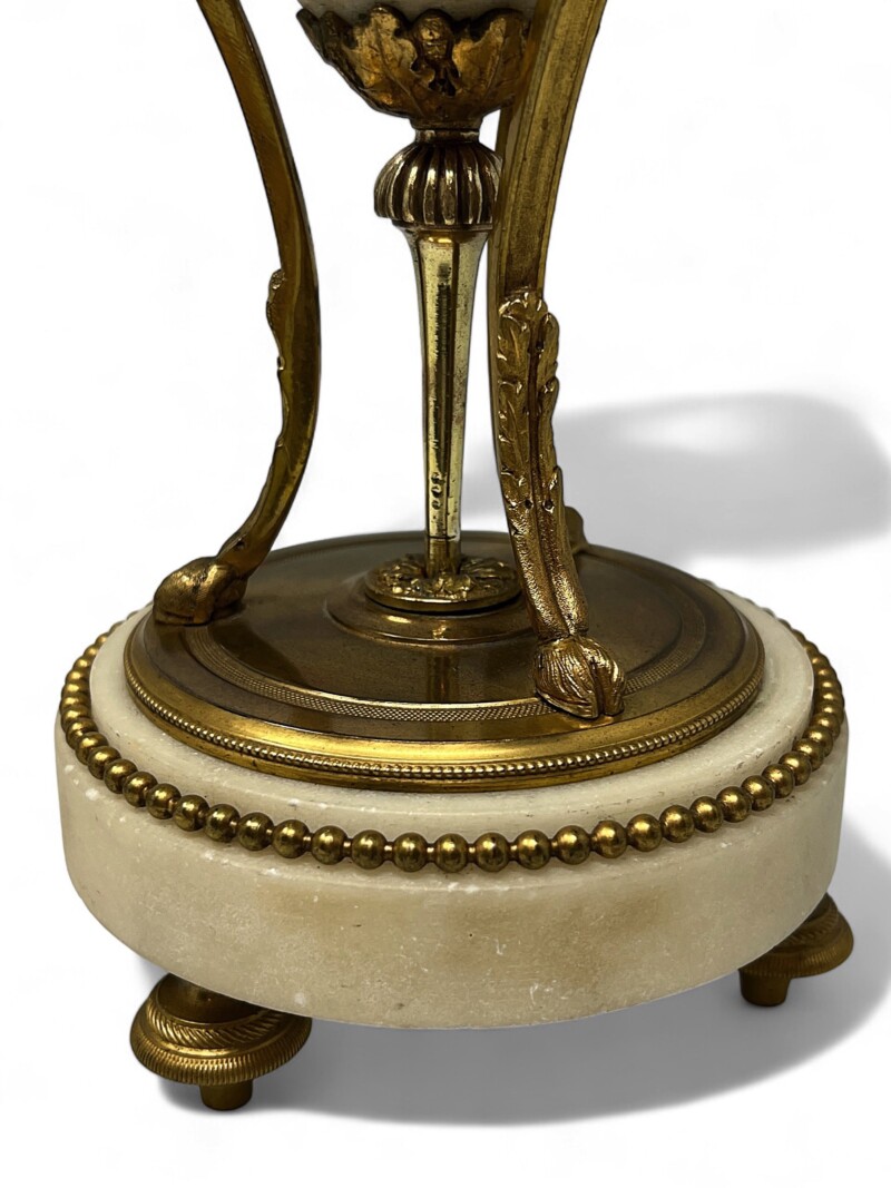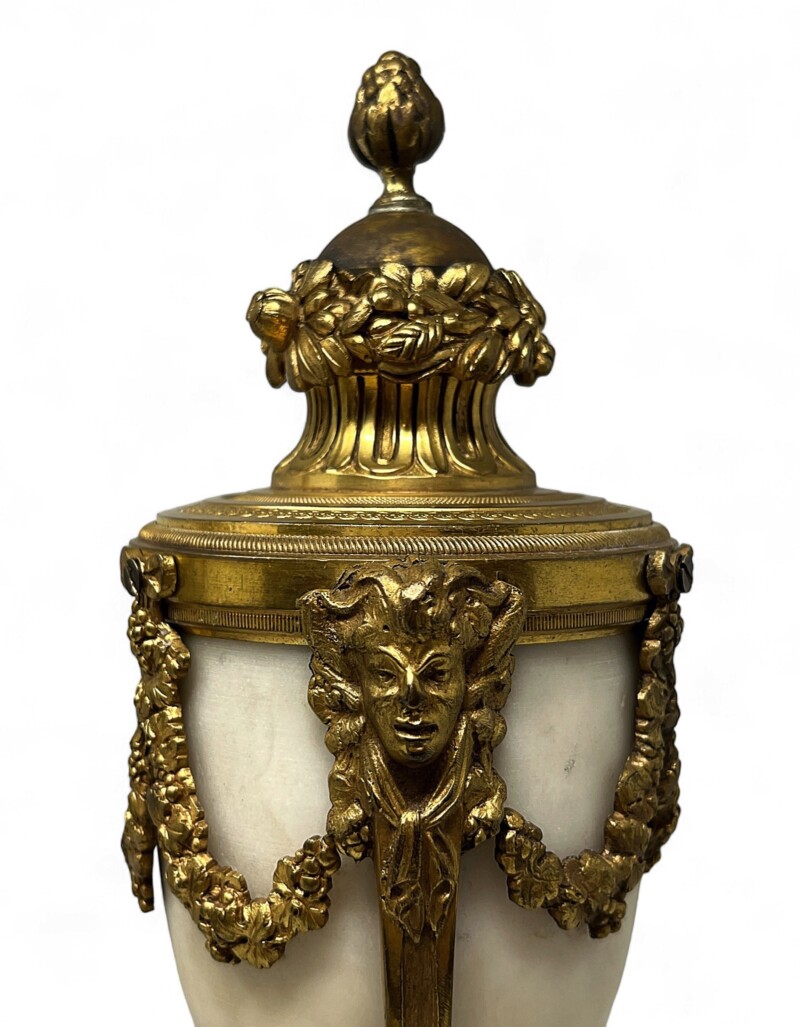 The lovely white marble main vessel is delicately curved and decorated in the upper register by acanthus leaves garland on all 3 sides and ultimately links the Pans’ heads. The upper part of the main vessel is decorated by a carved Ormolu wreath of foliage and topped with a blackberry shaped finial.