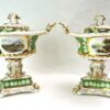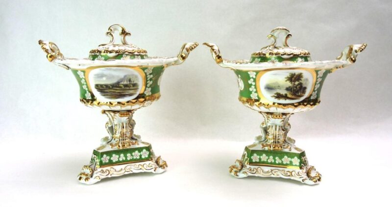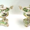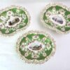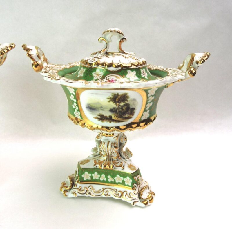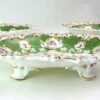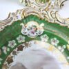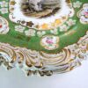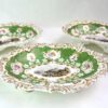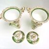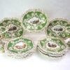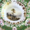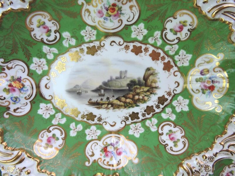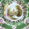 Each piece is hand painted with a different lake, river or castle scene in England and Scotland – each location named on the back of each piece.   Beautiful hand painted flowers, gilt grapes & leaves and gilt scrolls also heavily decorate each piece over an apple green background.