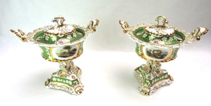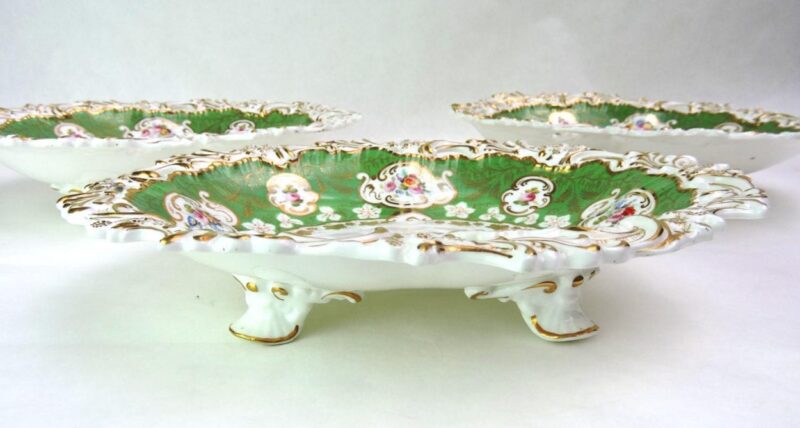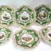 A spectacular porcelain dessert service consisting of 12 dessert plates, 3 footed serving dishes & 2 covered pedestal sauce dishes.  The set is made by Davenport – a prominent porcelain manufactory in Staffordshire, England from 1794 to 1887.