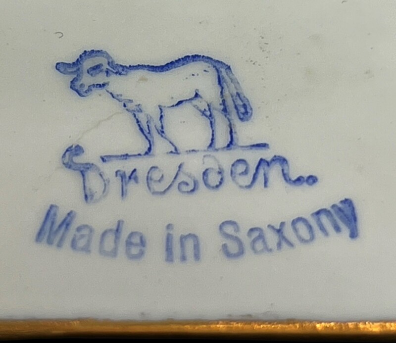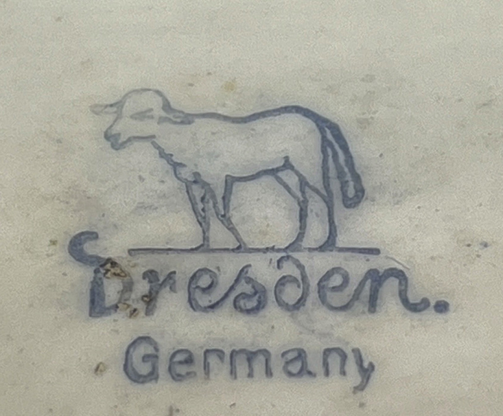 Ambrosius Lamm (engl. “lamb”, hence the mark) opened his porcelain decorating business in 1887. He mainly decorated the items in the well known “Dresden”, “Meissen” and “Kopenhagen” styles but around 1906 his speciality was the “Alt-Dresden” decoration (which represents a special form of flower arrangements) as well as the wide area of Watteau-type decorations and mythology. Shortly after the year 1934, Lamm retired and the business was taken over by his daughter who continued to use the same “lamb” marks. The street upon which the studio had been located was completely destroyed during the Dresden bombings in 1945.