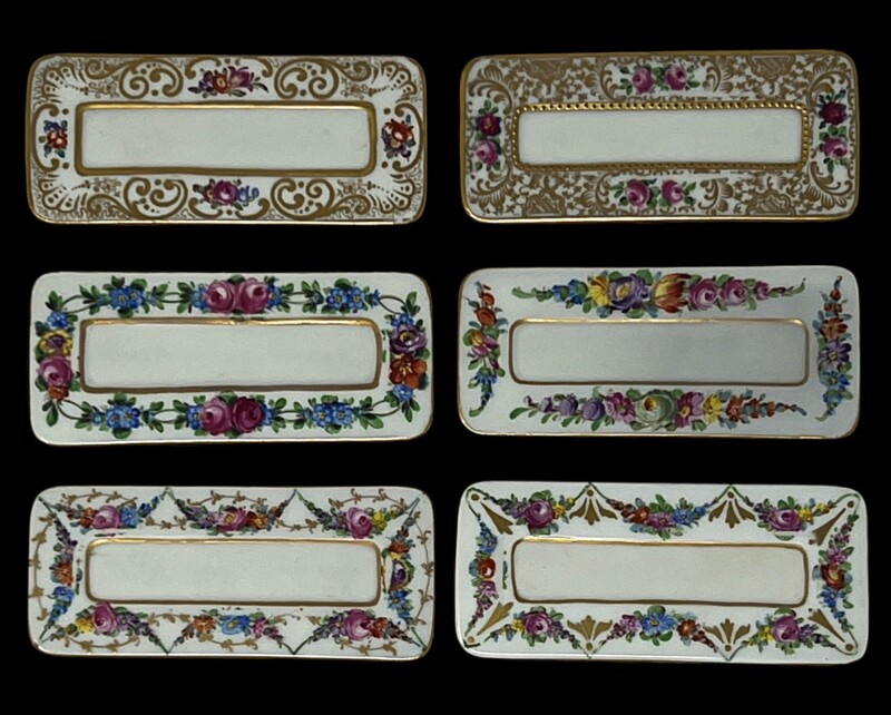Gift Ideas, PorcelainsLovely Dresden porcelain set of six precious name place card holders in their original box . Detailed and unique hand painting on each place card includes hand-painted floral bouquets and gold trim. Marked on the reverse with a “lamb” maker icon and the “Dresden Made in Saxony” mark was used after 1934.