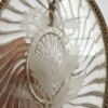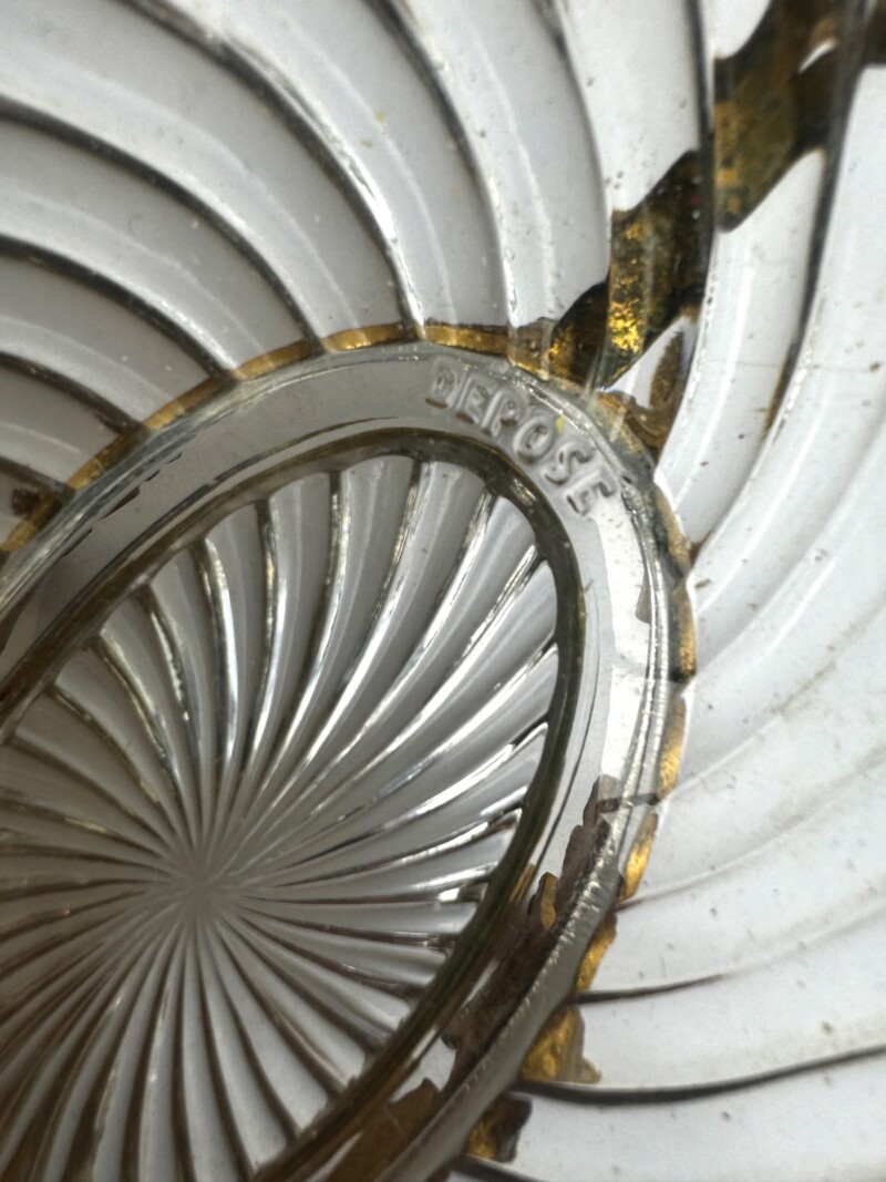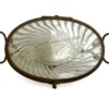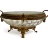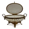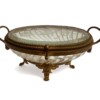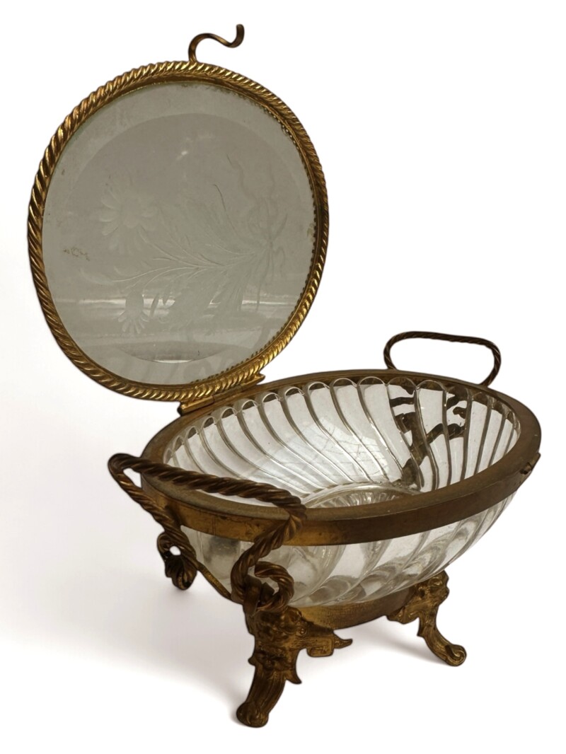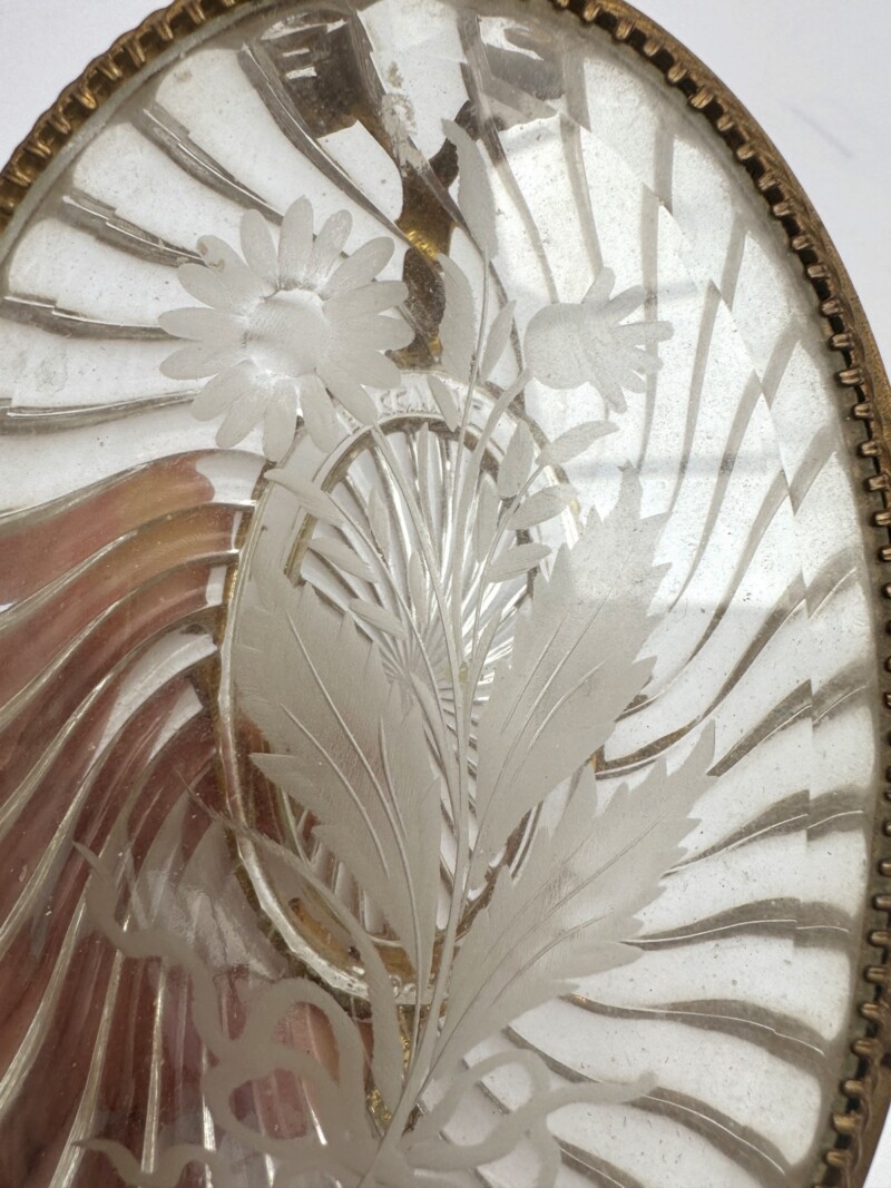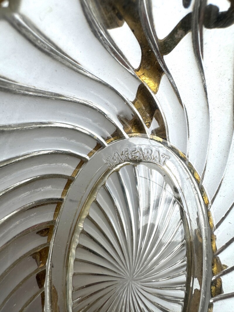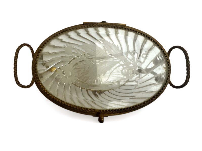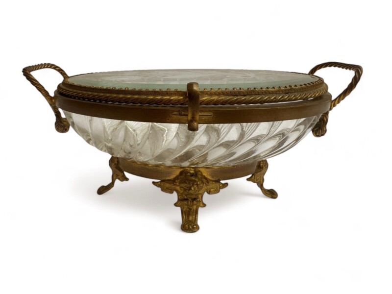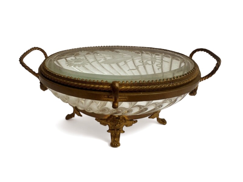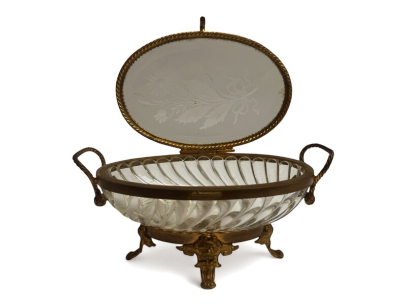 Gorgeous French signed “BACCARAT” oval-shaped cut crystal jewellery box. The crystal is chiseled into “twisted patterns” with the lid finely engraved in daisy flowers. The overall ormolu is stunning in its dore trimmed hinged lid with an “S” clasp, the double dore bronze loop “rope design” handles and 4 dore bronze feet.