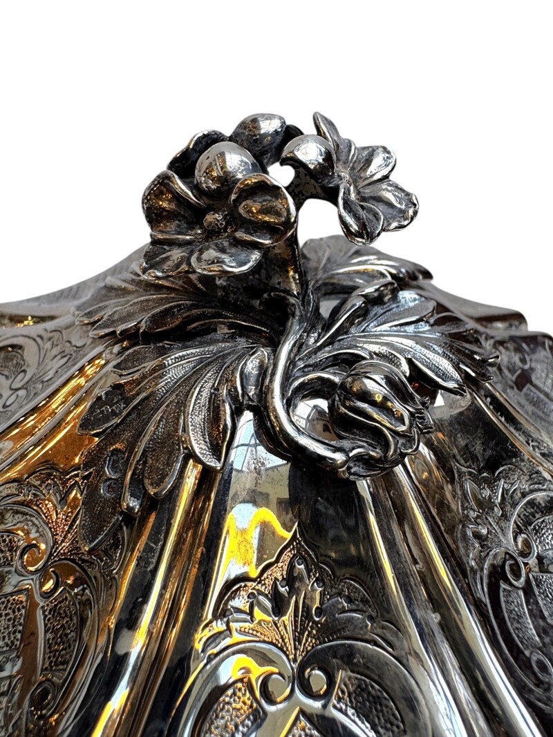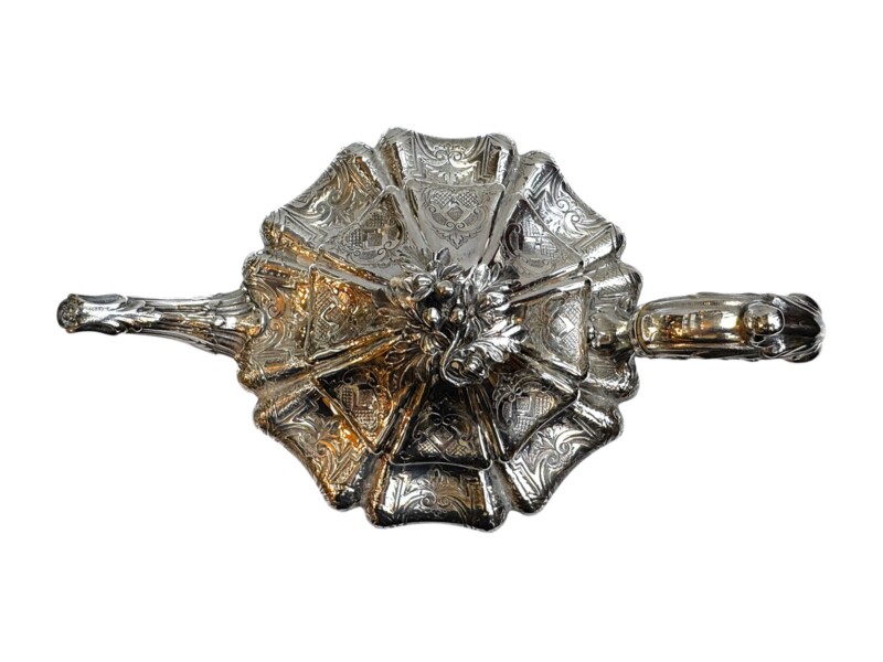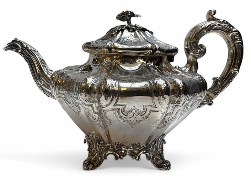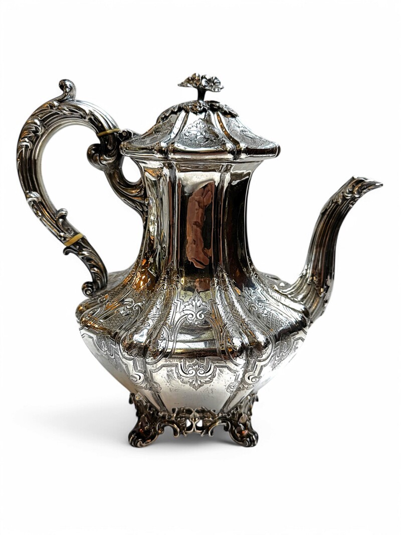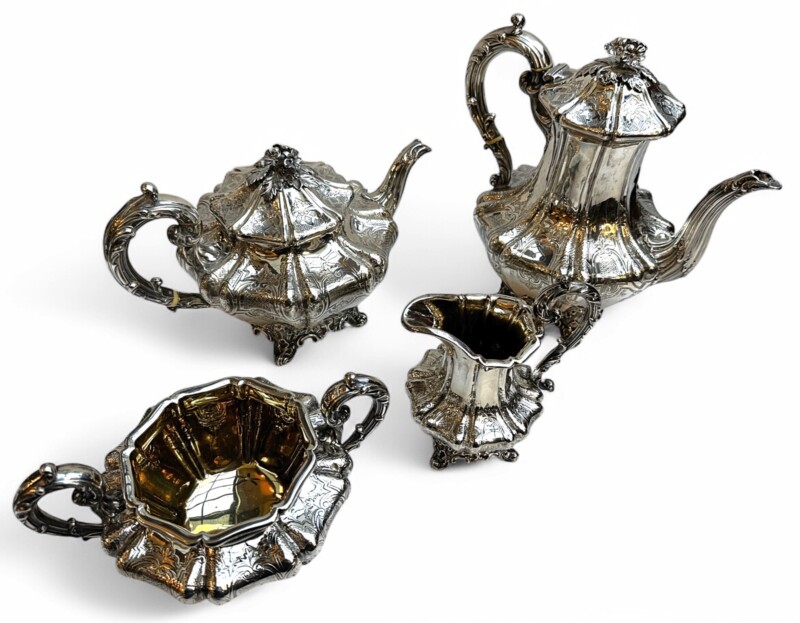 v** SOLD ARCHIVES **vLuxurious mid 19th Century English Victorian sterling silver four piece tea & coffee service by renowned silversmiths Edward, Edward Jr., John and William Barnard 1838, London. The company’s origins date back to about 1680, when the silversmith Anthony Nelme (d. 1722) established a firm in Ave Maria Lane, London. Edward Barnard was first manager and in 1829 became the proprietor, trading as Edward Barnard & Sons, with his sons Edward Barnard, John Barnard and William Barnard. In 1838, they moved to Angel Street, London. One of their most important commissions was the “Lily Font” by Queen Victoria in 1840 for the christening of their first child Princess Victoria.