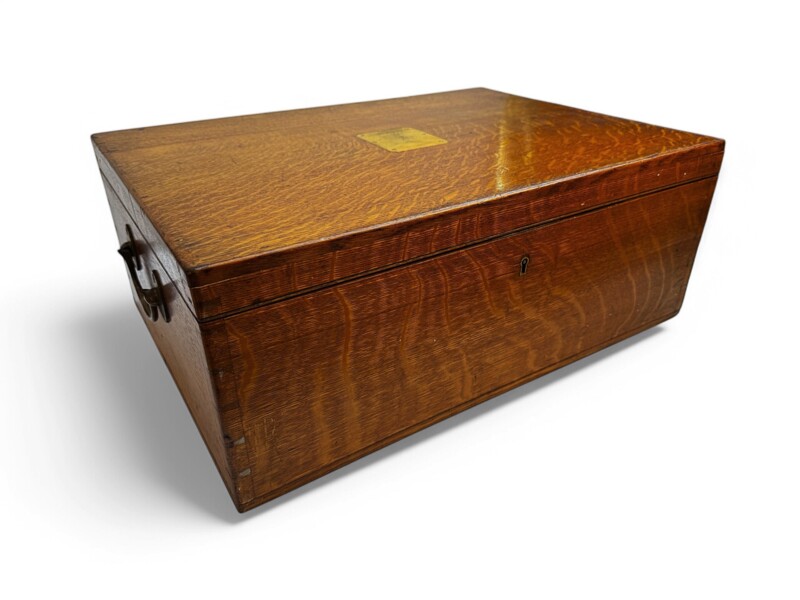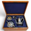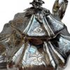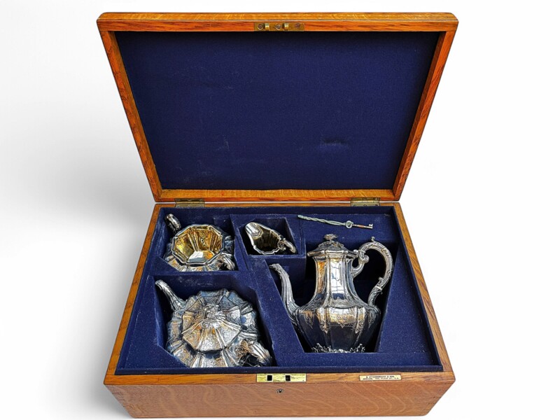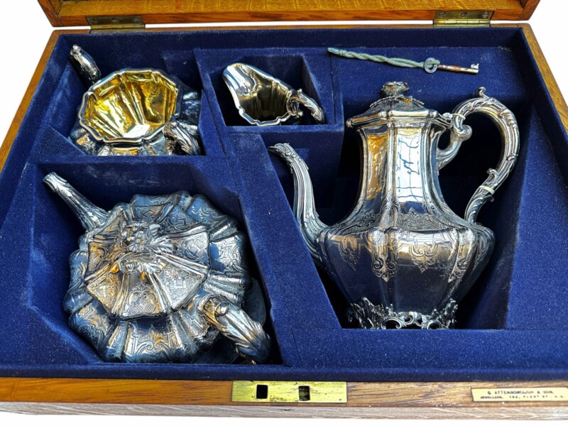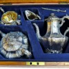This is a service has the most exquisite decoration, of lobed squat forms on leaf cast scrolled splay feet with scrolled foliate capped handles, ribbed spouts and hinged lids, to both the coffee and tea pots. The whole surround is etched in detail with abundant patterns and delicate top floral finials. The stunning and large original oak box (with working key) has handsome brass handles and hardware fittings, and is lined with gorgeous royal blue velvet.
