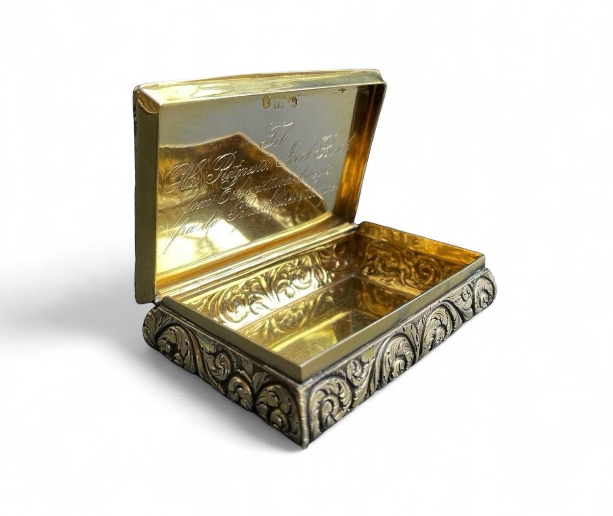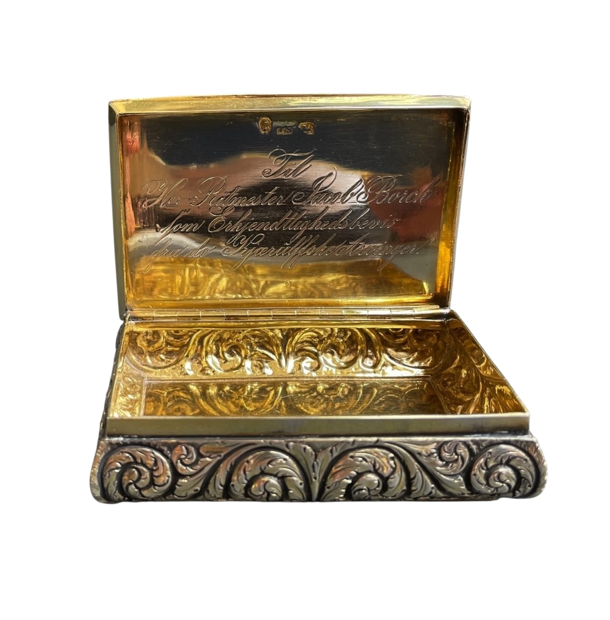The cartouche in the centre of the hinged lid is monogrammed “JB” for “Jacob Borch”. On the inside of the lid is an inscription, written in Norwegian. The translation reads: To Mr Reittmester (Cavalry Captain) Jacob Borch as a token of appreciation from the Heirs of Copenhagen” . Jacob Borch (1813-1886) was an important Norwegian merchant and later politician holding key positions in the Drammen City Council and Banking Committee. In 1860 he was sent by the Storting (Norwegian Parliament) to the coronation of Charles III in Stockholm. On the underside of the lid and on the bottom of the inside of the box are the hallmarks.