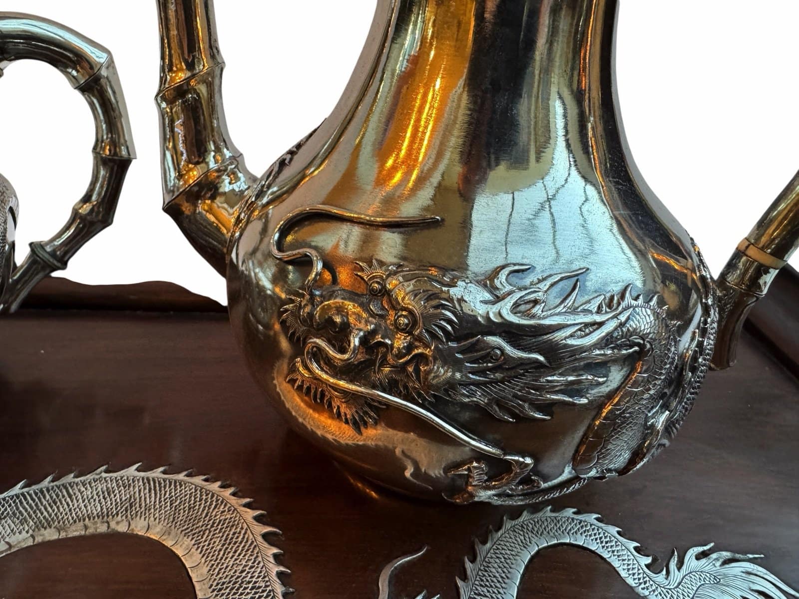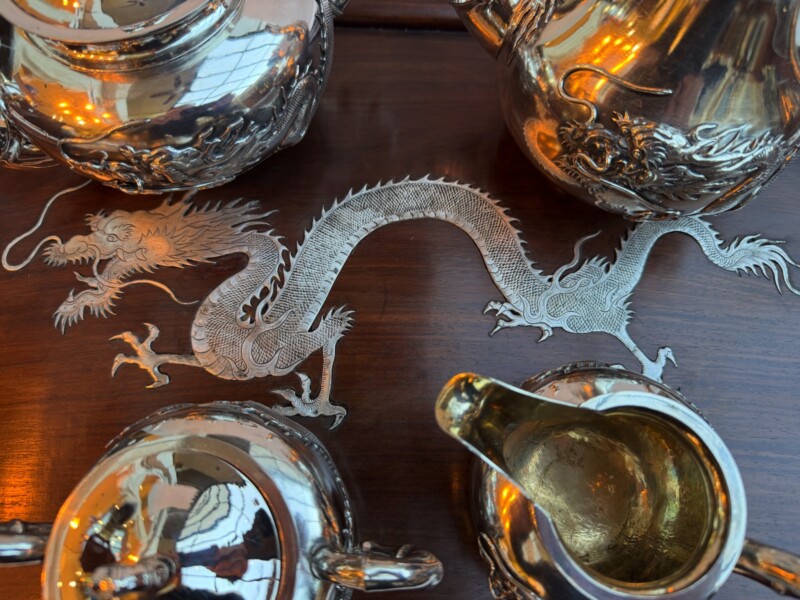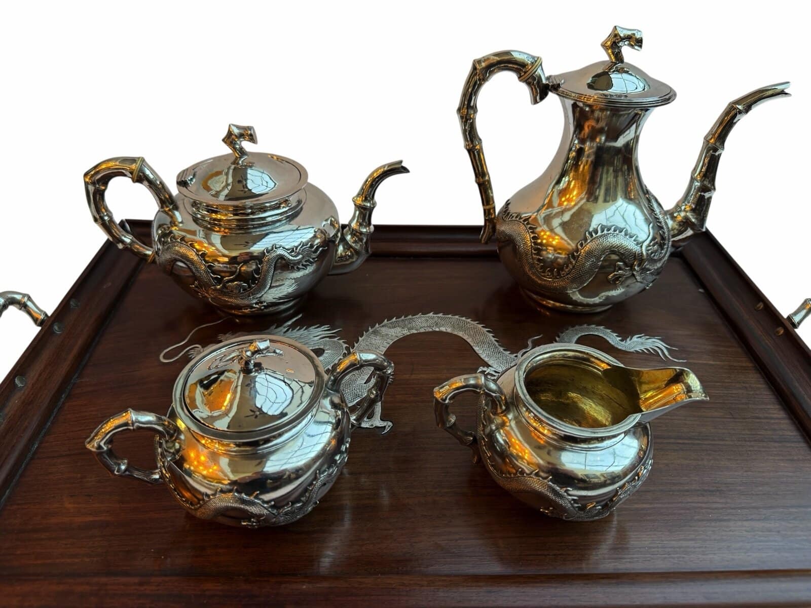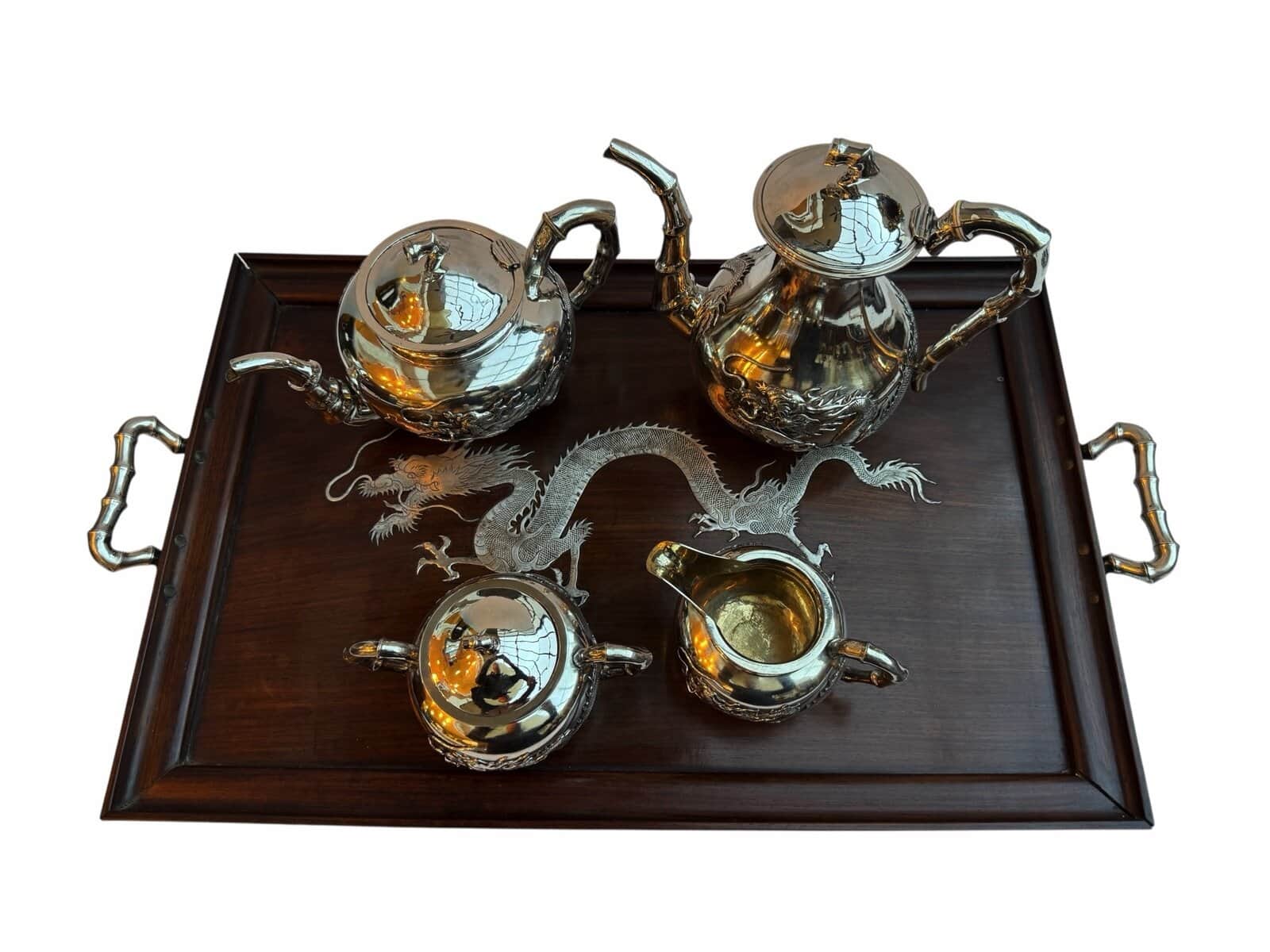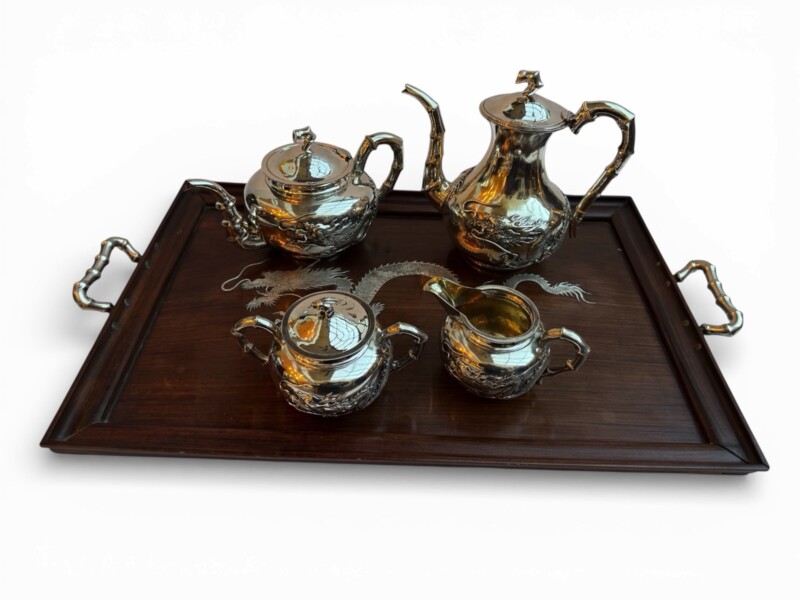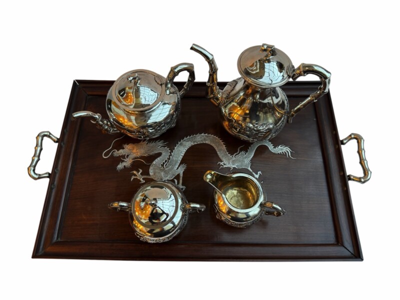 The service is presented on its original, large rosewood tray, a rare and exquisite addition featuring intricate silver wire inlays of a dragon and phoenix amidst auspicious clouds. The tray is further elevated by hammered silver corner guards and matching bamboo-shaped handles, creating a visually stunning and cohesive ensemble. The set is in exceptional antique condition, featuring crisp, deeply struck hallmarks including the “WH” firm mark, the”90″purity stamp, and the original artisan’s Chinese chopmark.