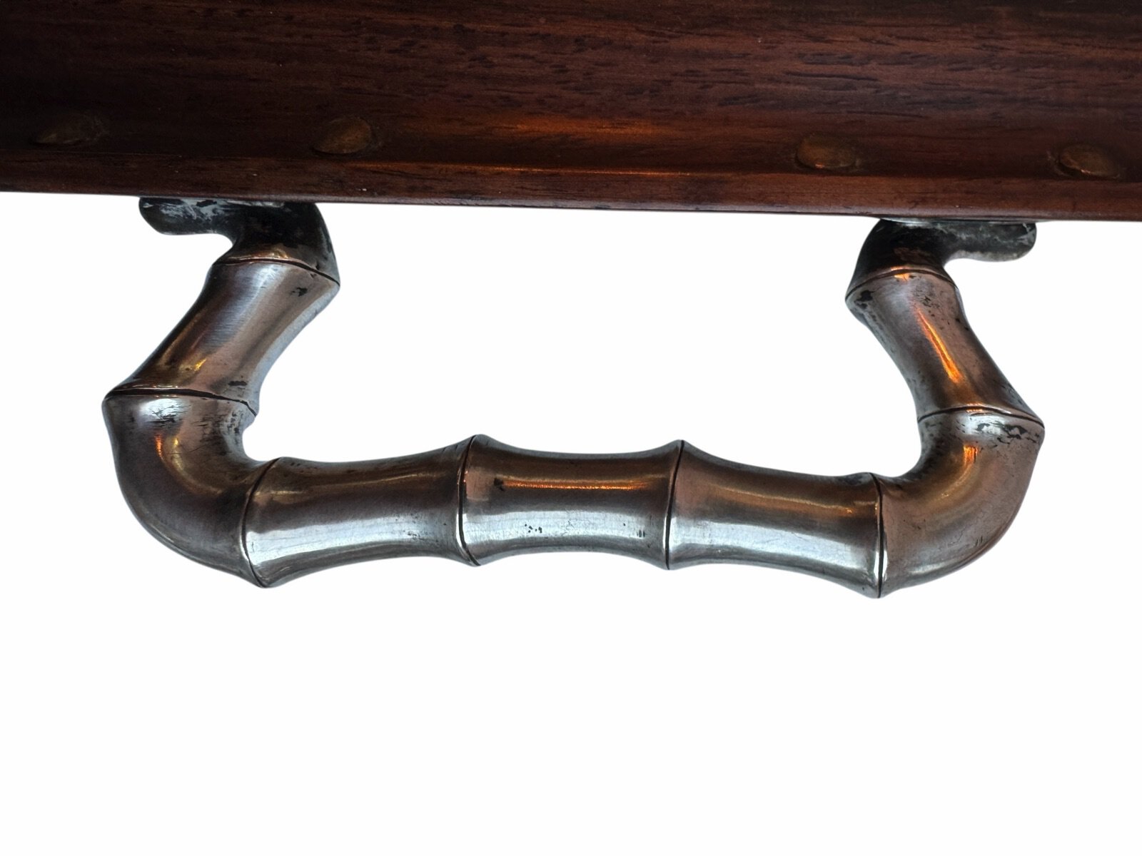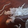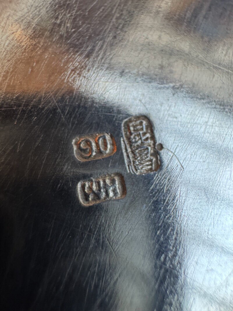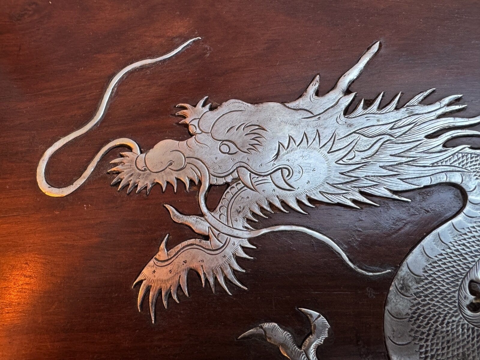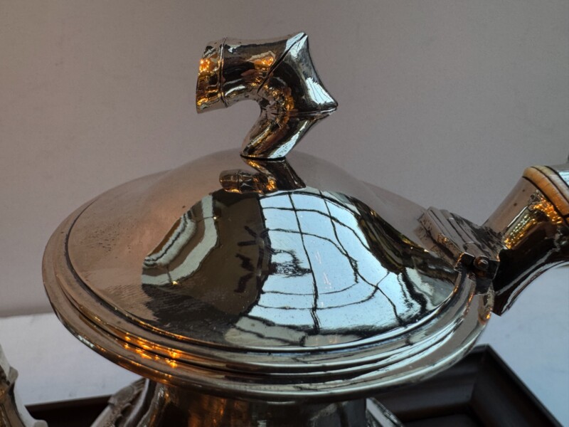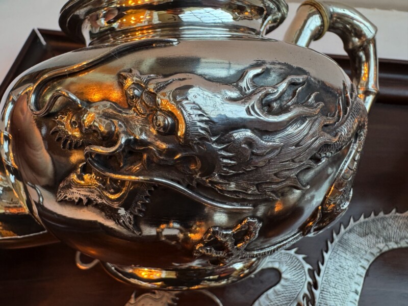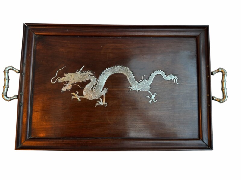 The service is presented on its original, large rosewood tray, a rare and exquisite addition featuring intricate silver wire inlays of a dragon and phoenix amidst auspicious clouds. The tray is further elevated by hammered silver corner guards and matching bamboo-shaped handles, creating a visually stunning and cohesive ensemble. The set is in exceptional antique condition, featuring crisp, deeply struck hallmarks including the “WH” firm mark, the”90″purity stamp, and the original artisan’s Chinese chopmark.