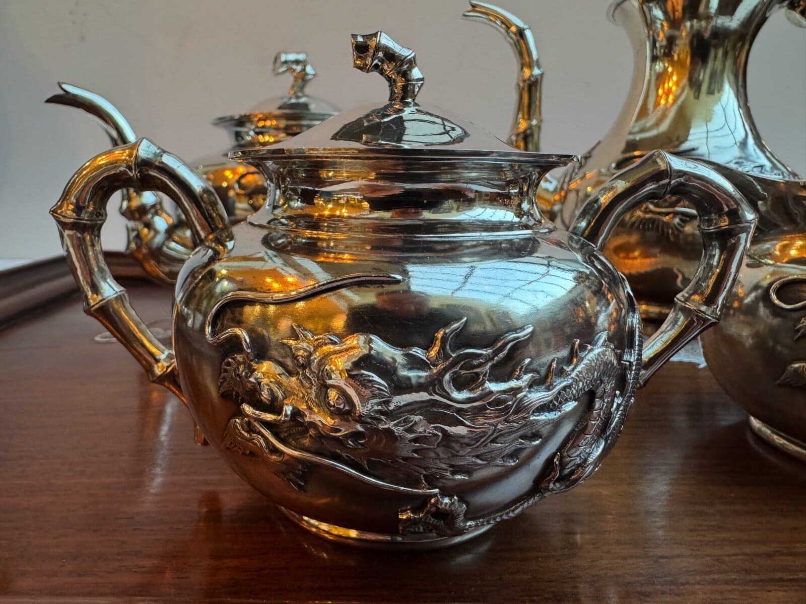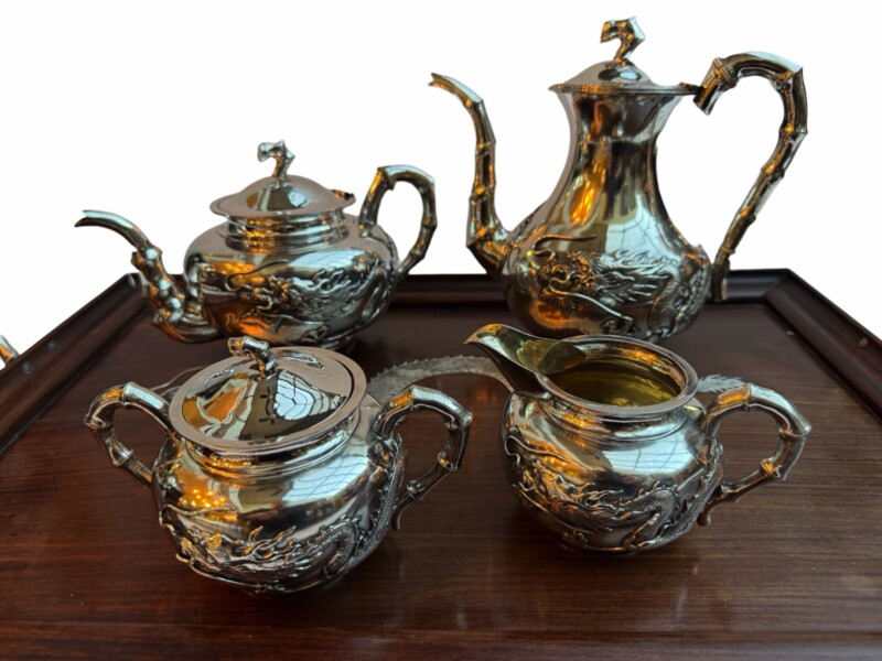 Oriental / Asian, Silver HollowareThis magnificent “Chinese export silver” four-piece tea service by the prestigious firm “Wang Hing & Company” represents the pinnacle of late 19th-century luxury, dating to approximately 1890–1910. The set comprises a teapot, hot water pot, cream jug, and covered sugar bowl, totaling a substantial 2 kilograms (approx. 64.3 troy ounces) of high-grade silver. Each vessel is masterfully decorated with high-relief repoussé imperial dragons winding through celestial clouds, accented by elegant bamboo-form handles and spouts that symbolize strength and longevity.