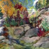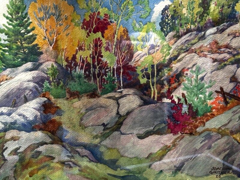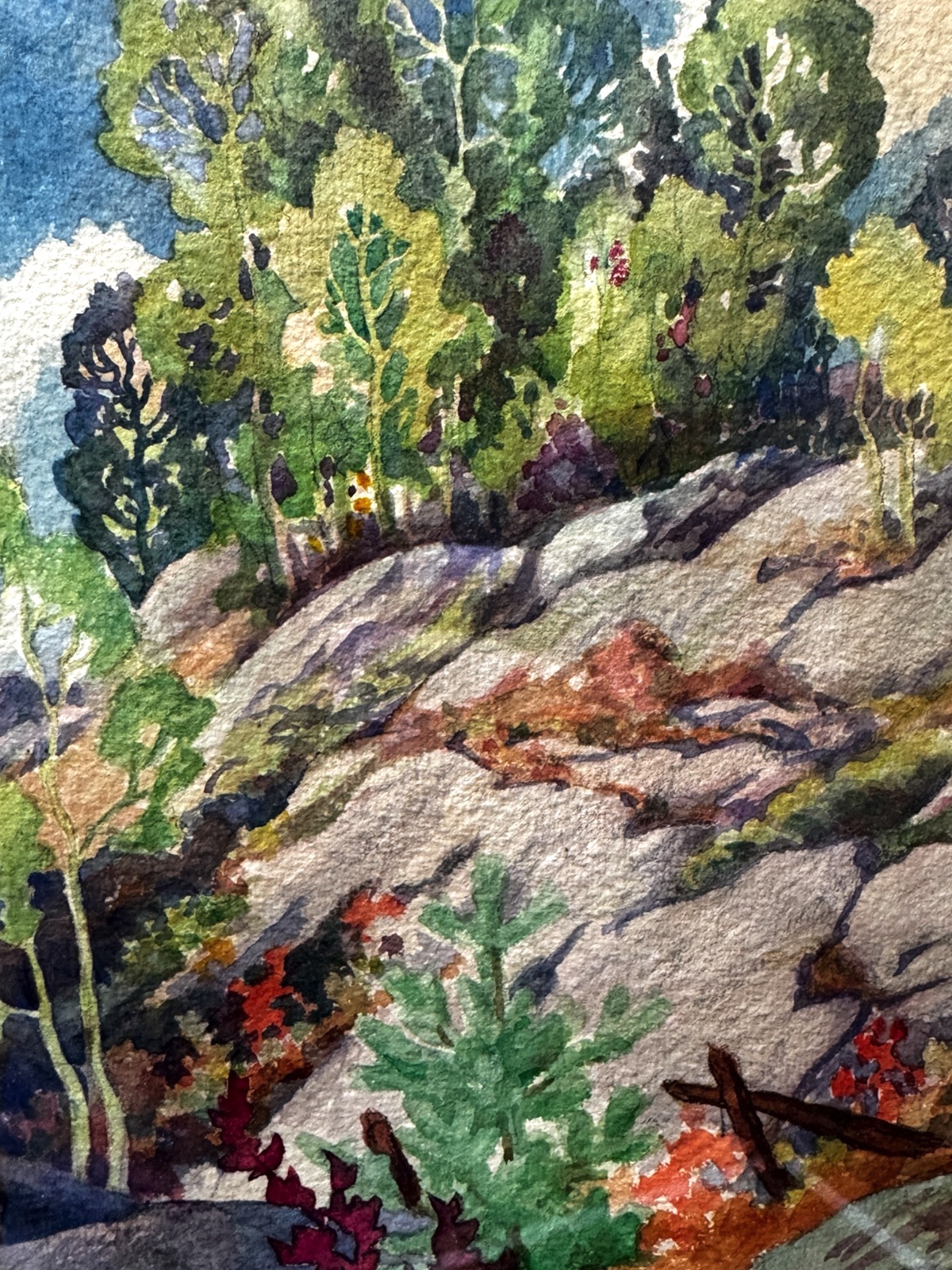 This wonderfully large watercolour is a skillfully composed early watercolour by Gauthier depicting a classic Ontario Shield landscape with granite outcrops and autumn foliage. The overall intensity of the colour and fine brushwork promotes “a calm feeling “. The very sophisticated hues are cohesively “from nature”, and draw your eye in from the the bottom right “as if you want to go on a hike” up the moss covered granite.