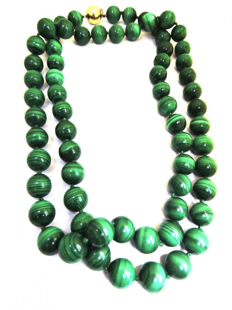 A quite large malachite beads necklace with a unique 14K gold clasp. The piece is a delightful variegation of large malachite beads, and a glossy gold bead clasp. It is rather long in length it makes a bold  piece with a vibrant green colour. The piece is easily accessible to wear and take off.
