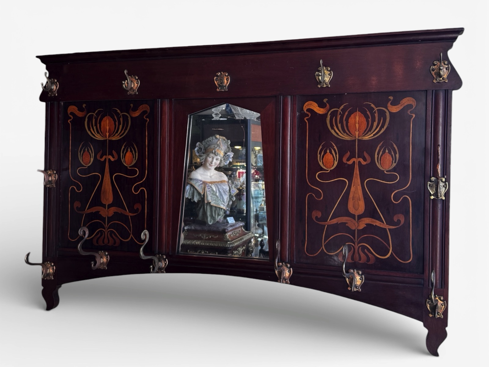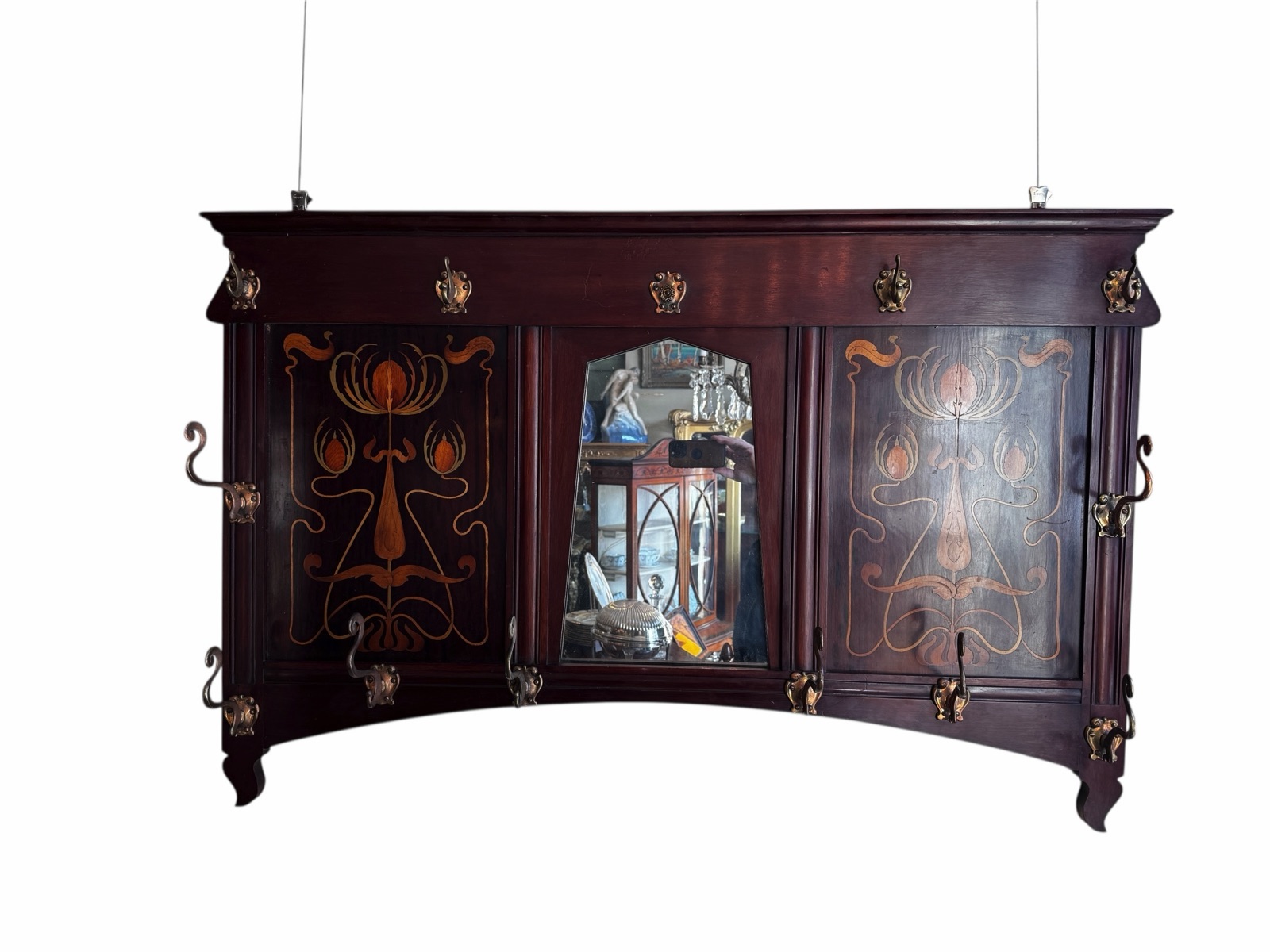 Marvellous & Rare English “Shapland & Petter” Arts & Crafts Large Hall Mirror/ Hat & Coat Rack with Stunning British Art Nouveau Floral Marquetry, Mahogany & Inlaid Satinwood with Spectacular Brass Hardware, c.1900–1910