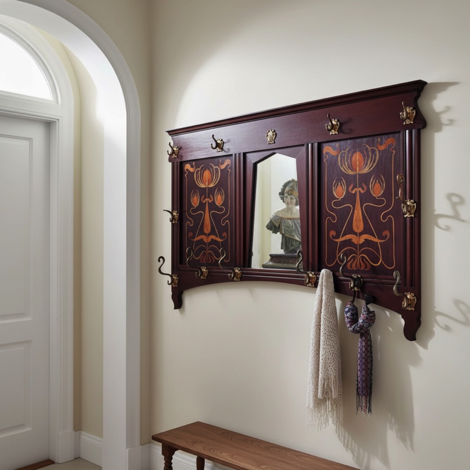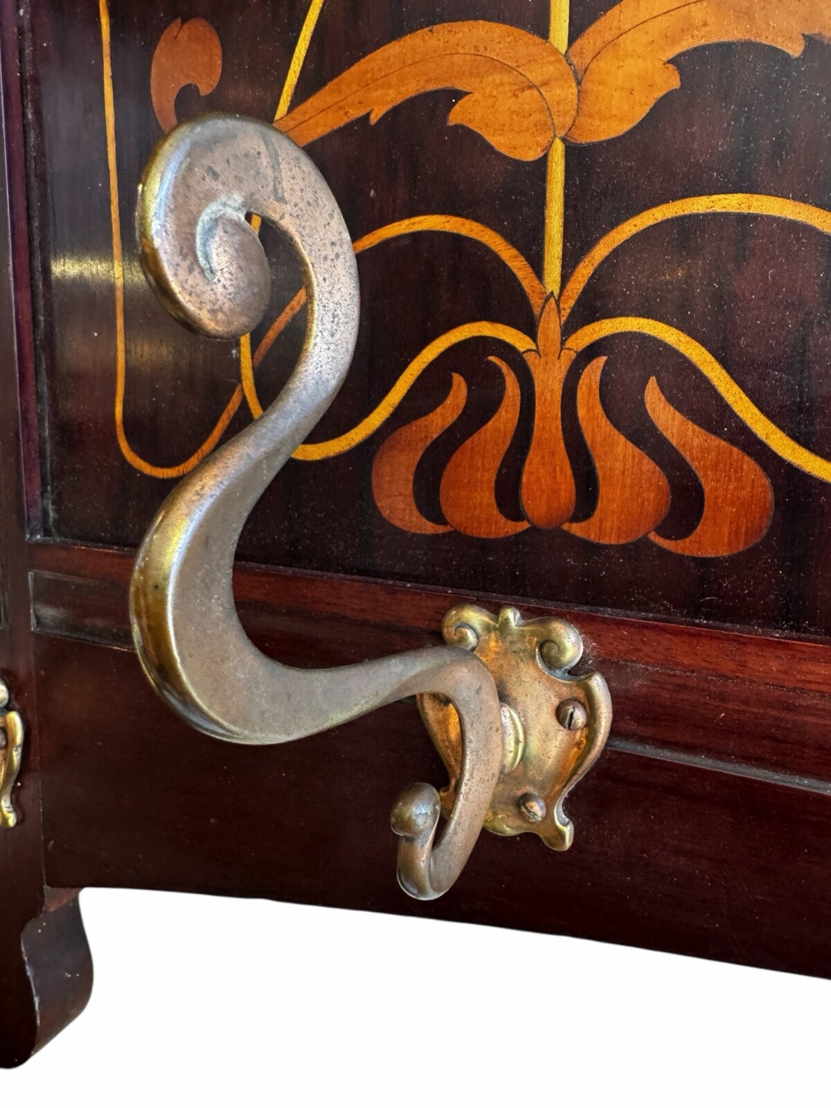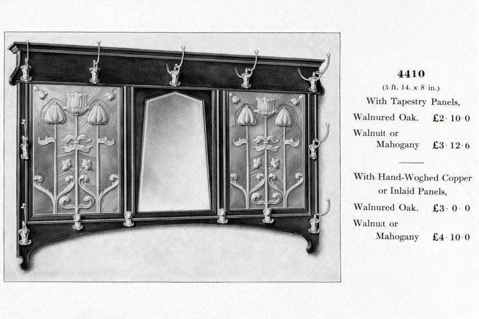 FurnitureShapland & Petter of Barnstaple, Devon were one of the key English firms producing Art Nouveau–influenced furniture around the turn of the 20th century. The contrasting woods of mahogany with satinwood inlay are stylized designs of symmetrical elongated flower forms and flowing tendrils, a great example of British Art Nouveau and extremely consistent with Shapland & Petter designs. Brass hooks with organic curves and sinuous shapes also reflect the British Art Nouveau style.