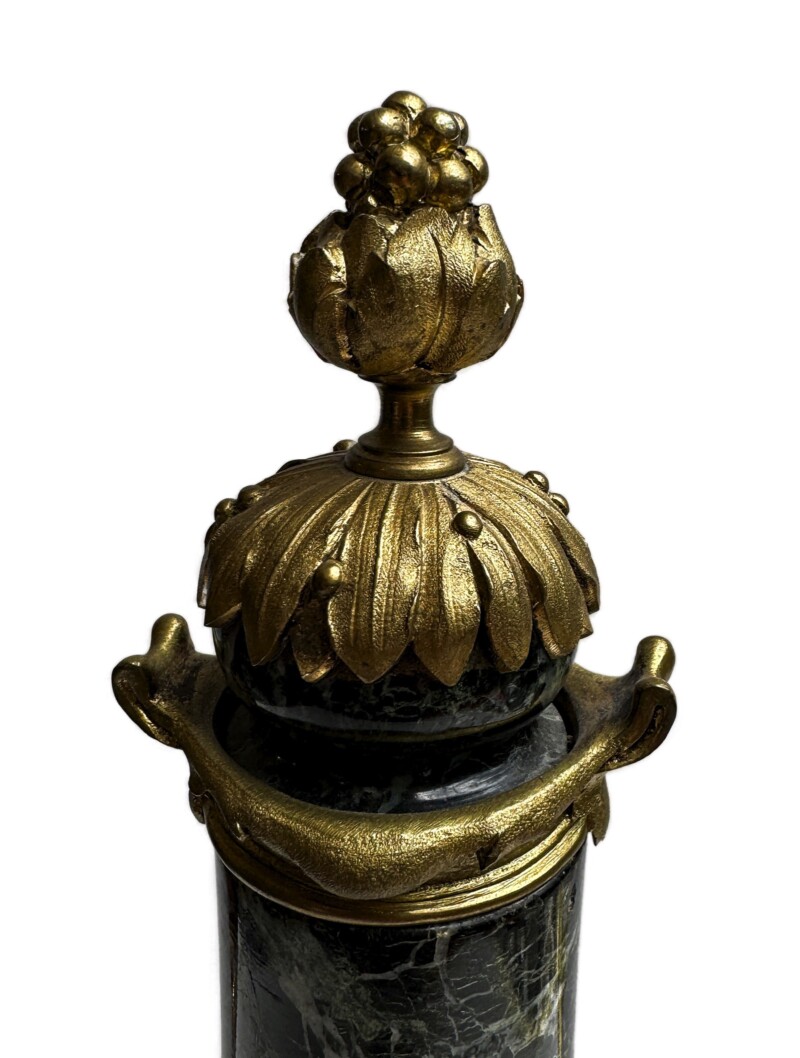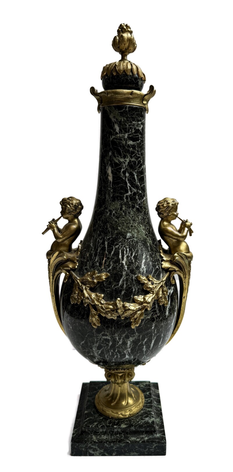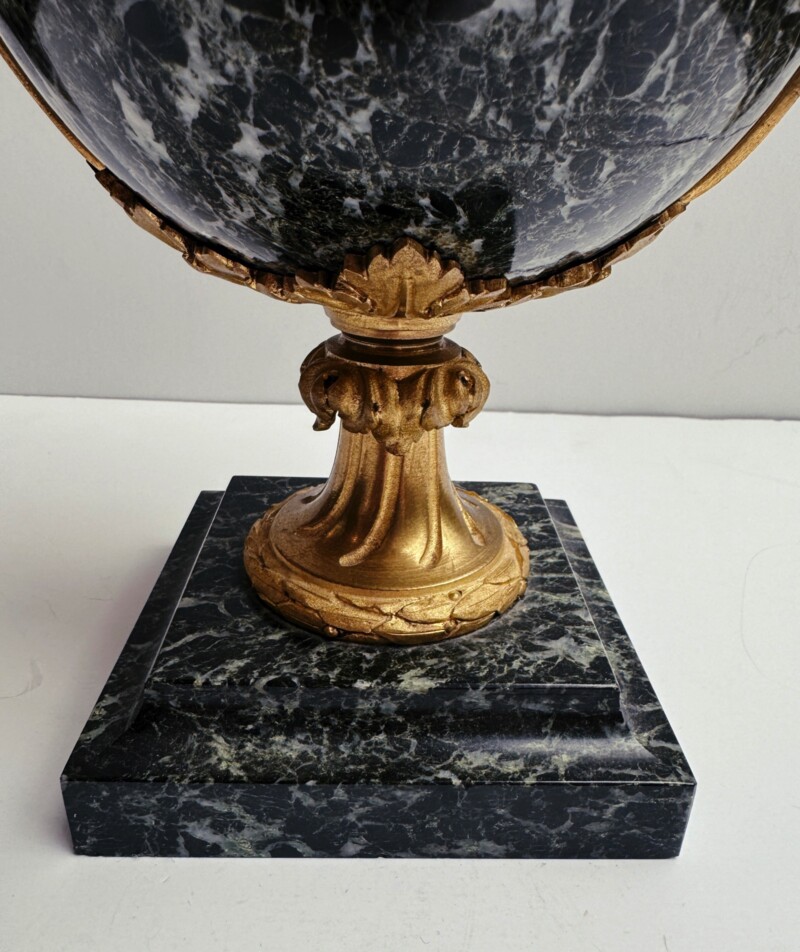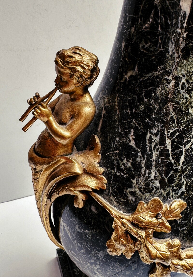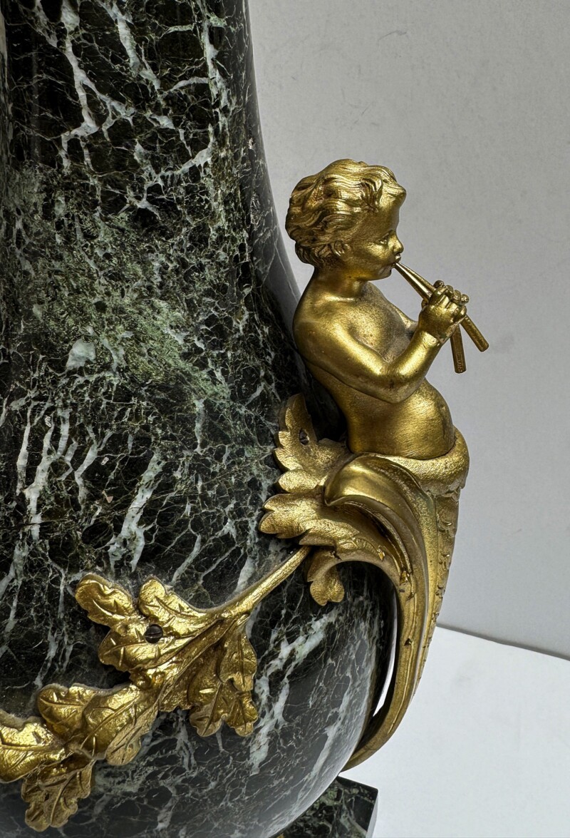 Marvelous Deeply Veined Green Marble Urn with Bronze Cherub Mounts and Trim, Circa 1900