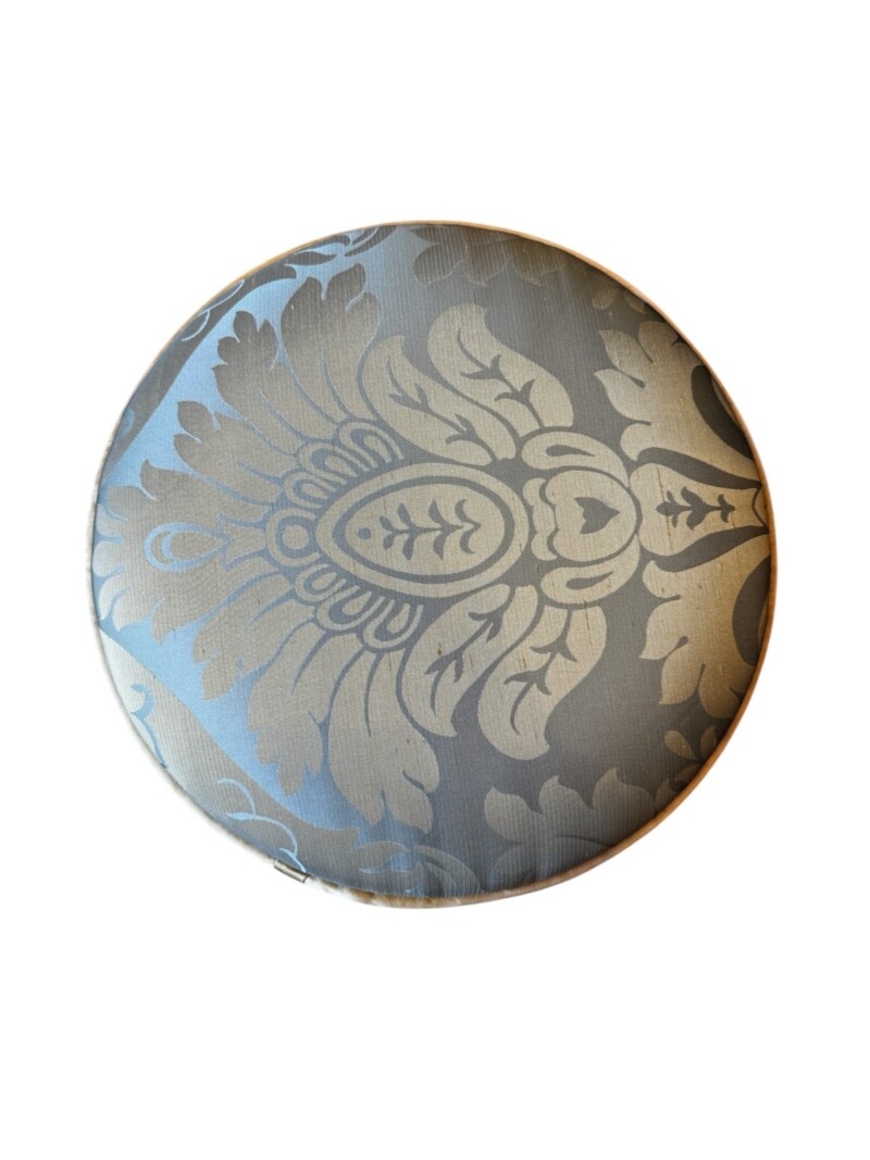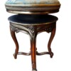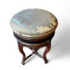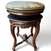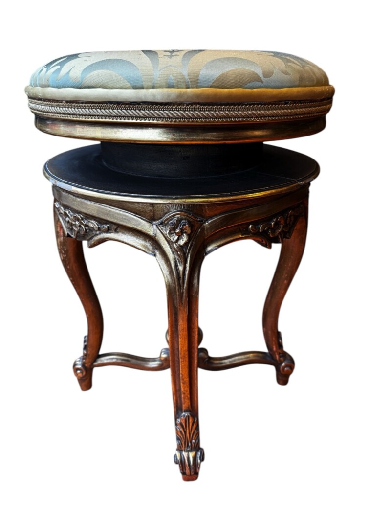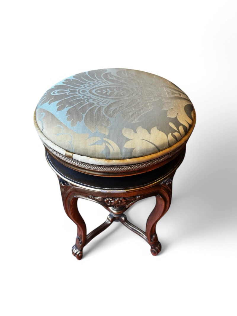 This elegant Louis XV style carved guilt wood stool functions as a piano or vanity stool, having round seating and cabriole legs. The gorgeous satin upholstery fabric is over a scalloped apron embellished with guilt wood hand carved flowers and leaf decor. The cabriole legs have carved flowers at the shoulders and end with escargot feet.  The adjustable revolving seat extends up to 4 additional inches, with a screw mechanism that twists the comfortable seat up and down. The stool is in very good condition commensurate with age and use, and adorns a rich gilt wood patina.