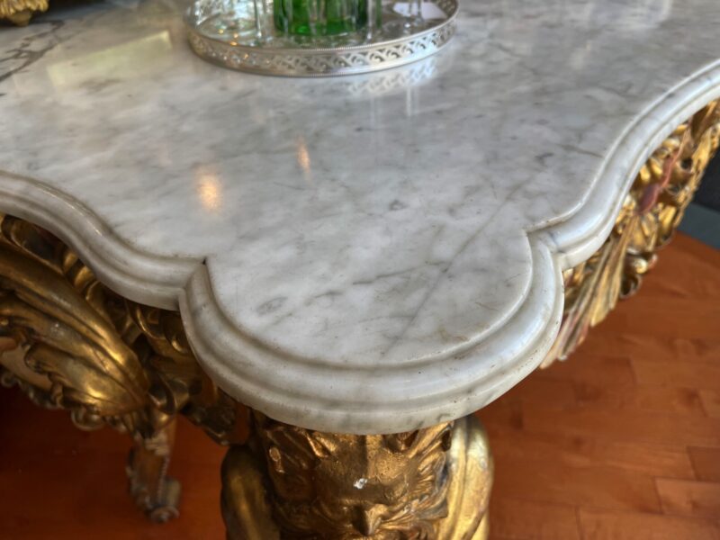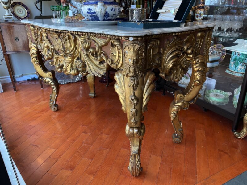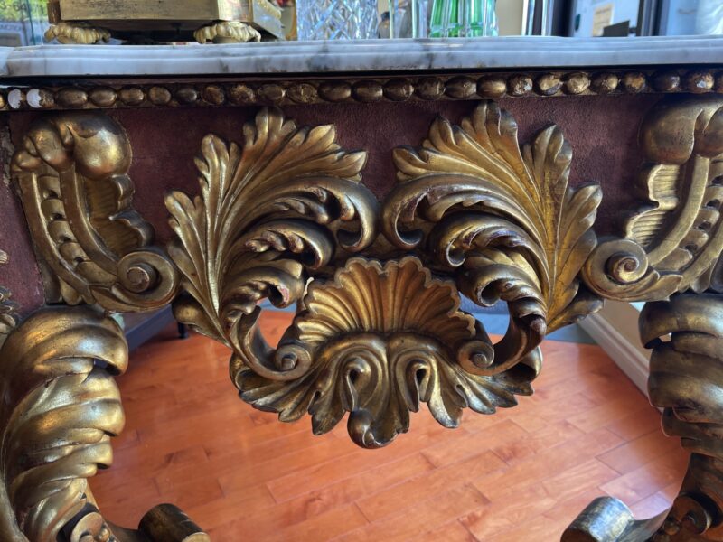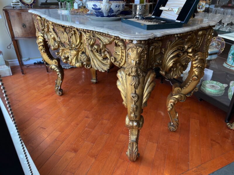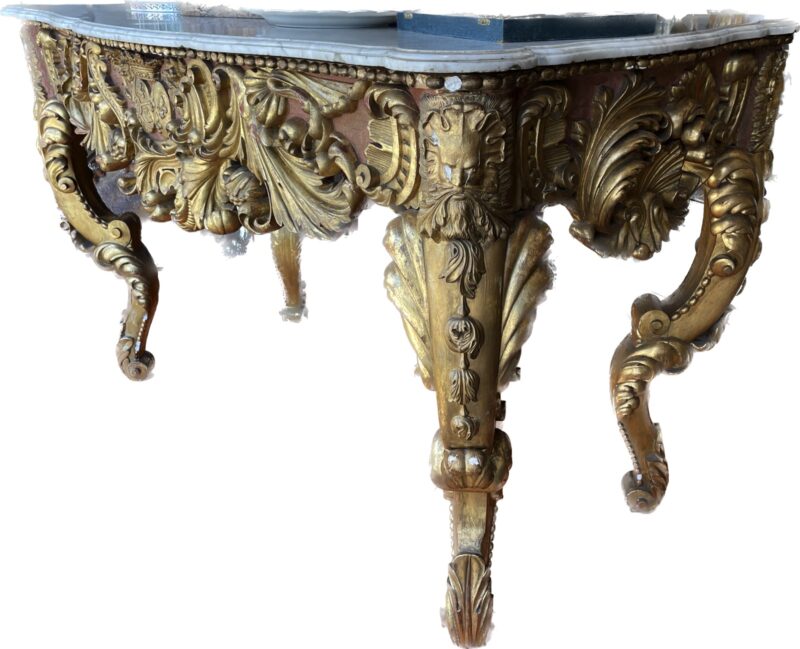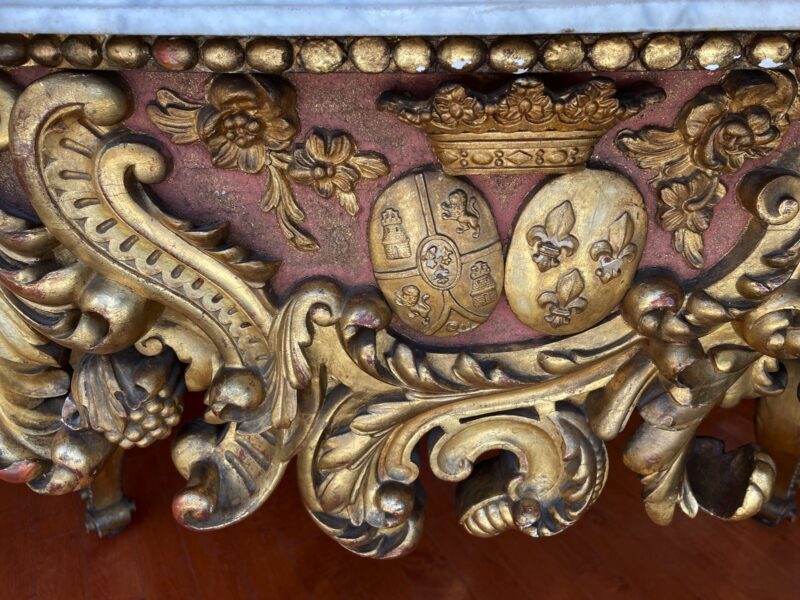 A massive Early 19th Century French gilt wood & marble top console with gesso carved decorations. Having four solid cabriole legs with face mask decorations on each corner and family crest shields with Fleur-de-lis carvings on the front centre. The marble has a white polished top and is hand chiseled underneath. The furniture maker ‘S A’ impressed on the back.
