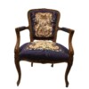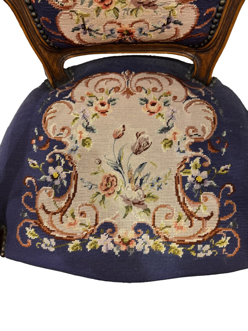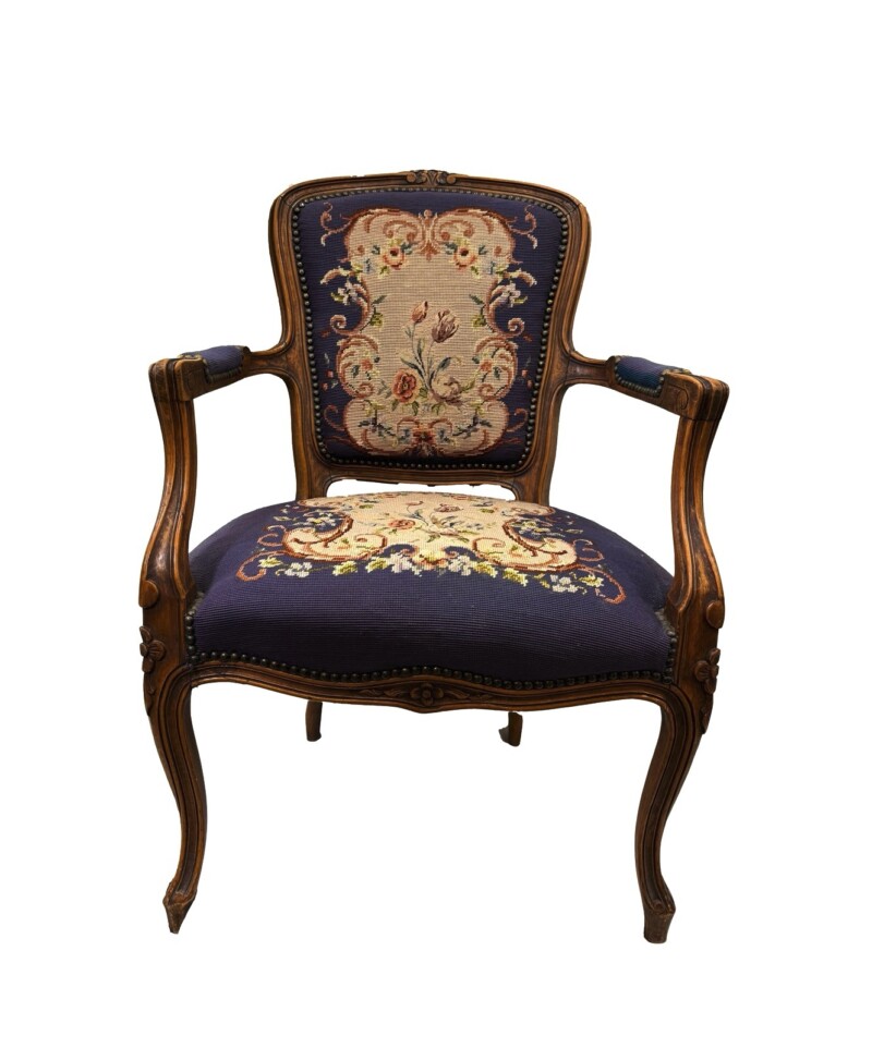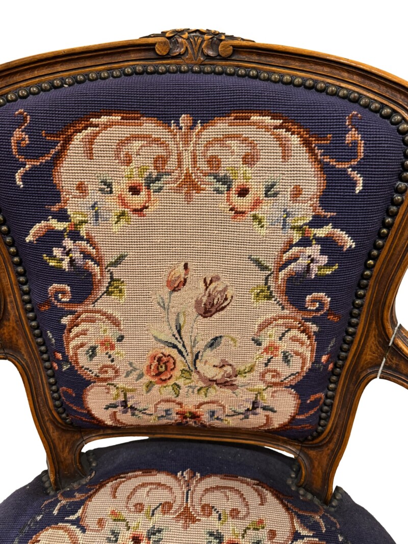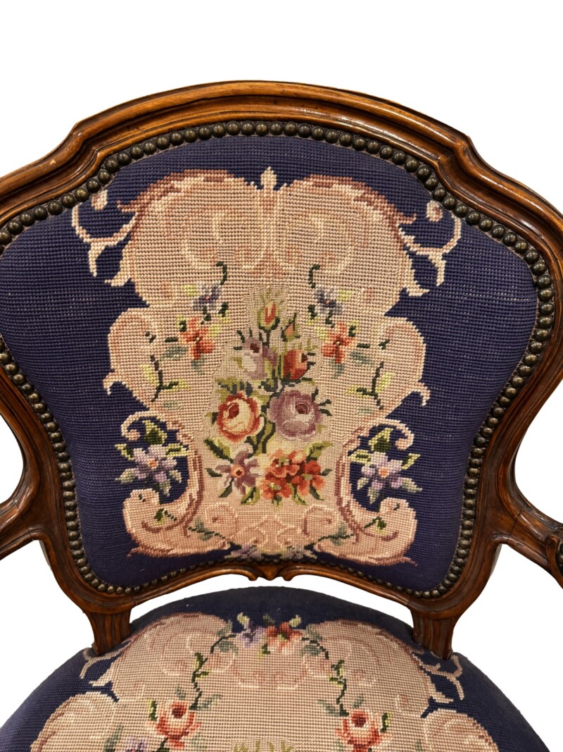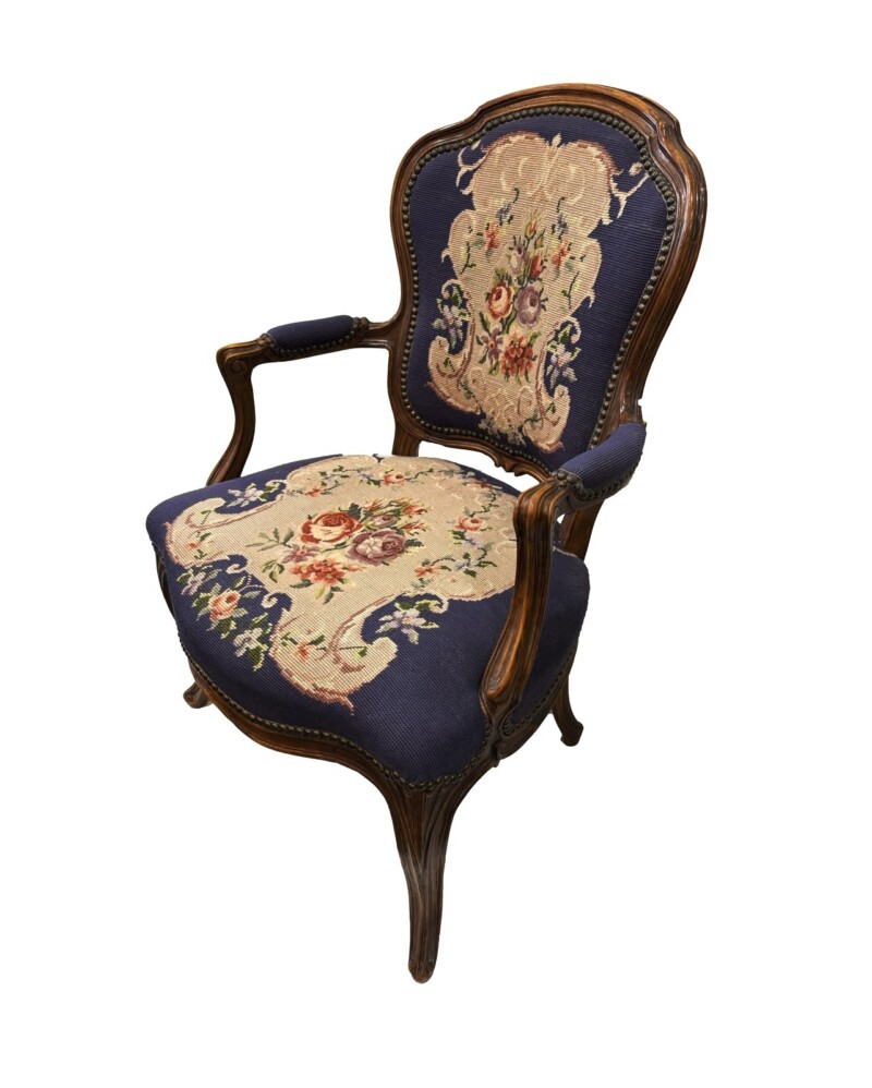 A lovely French Louis XV arm chairs, circa 1900,  with carved floral motif, blue floral petit point in excellent condition and terminating on stylized cabriole legs. A timeless classic design.