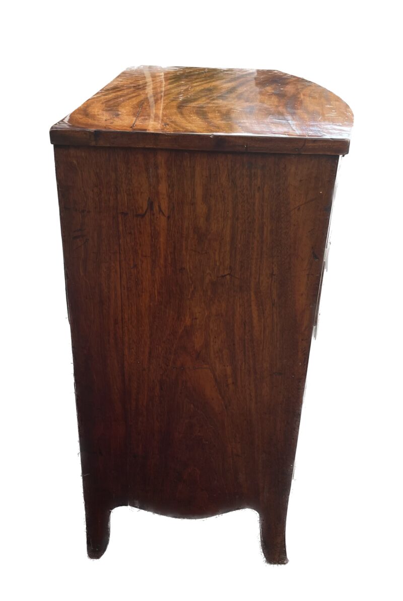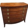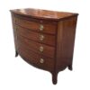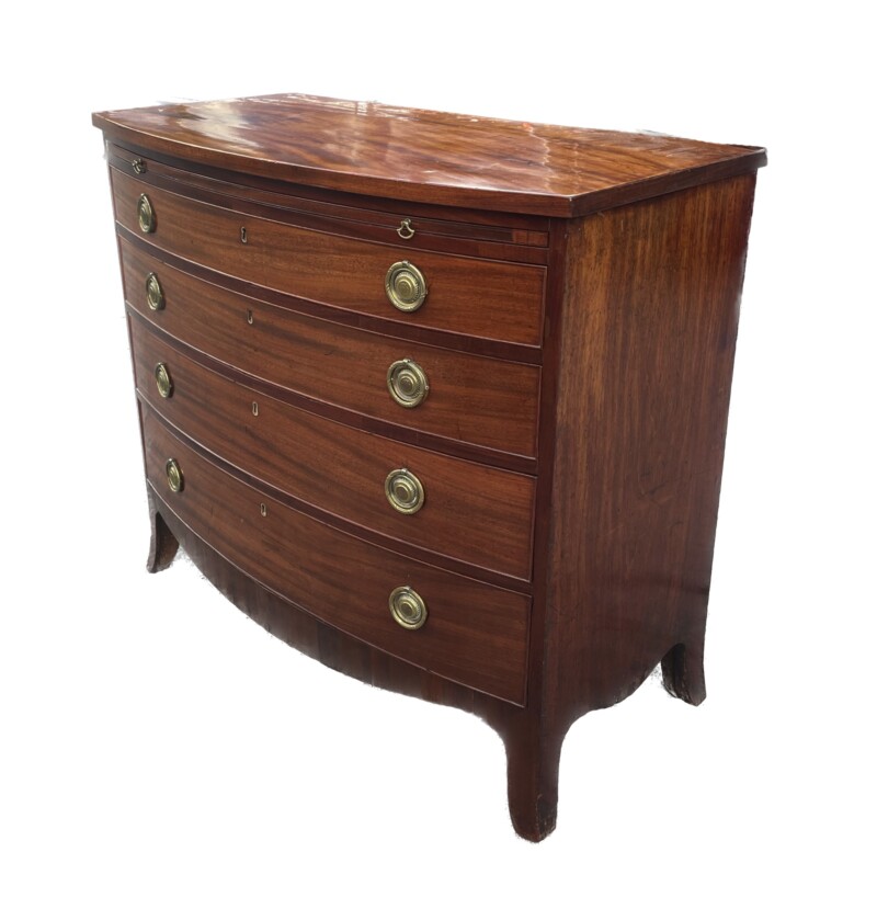 A medium sized bow front chest with 4 wide drawers that are graduated in size from thinner on the top to deeper on the bottom.  Each drawer has 2 brass round pulls.  The chest sits on Georgian splayed feet.  There is a pull out narrow shelf that pulls out to help fold clothes – or can add as some extra shelf space.