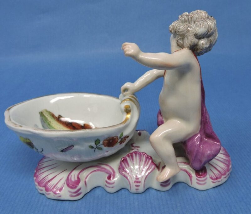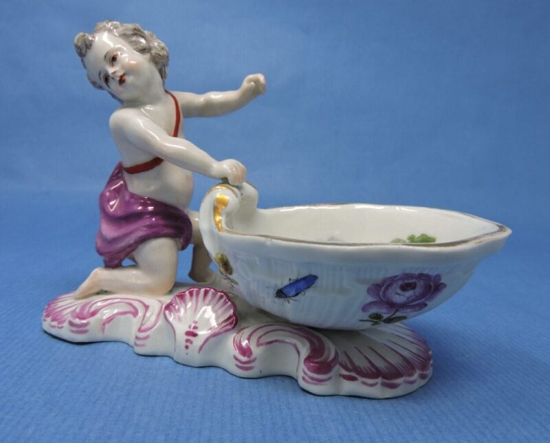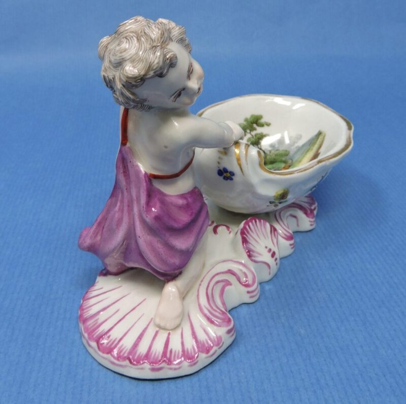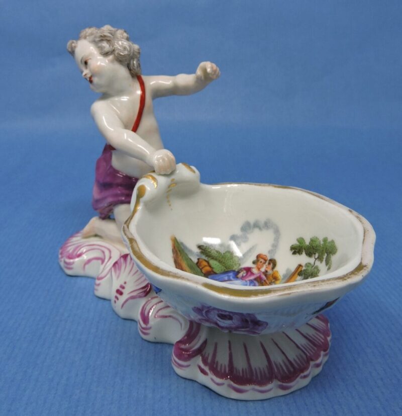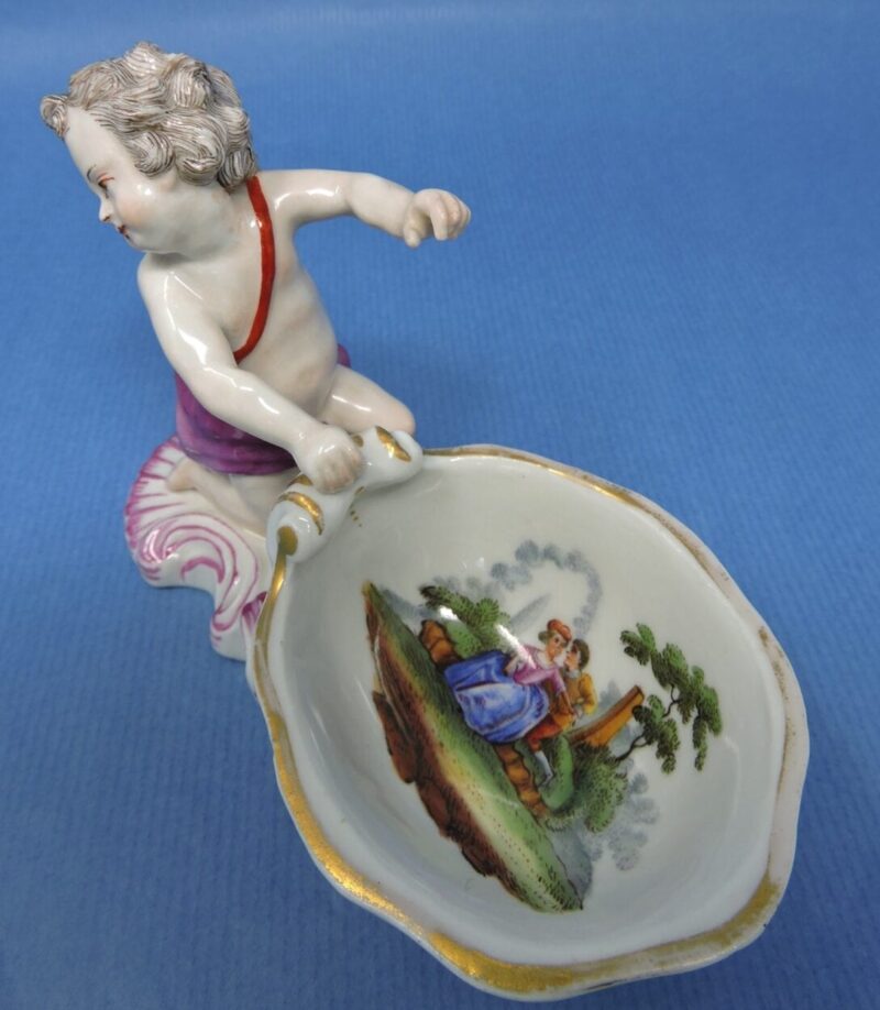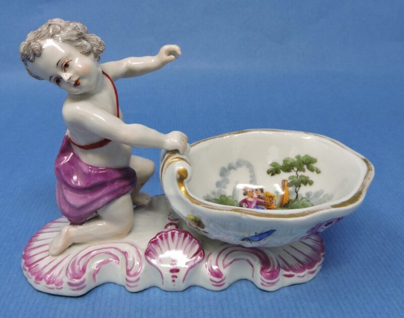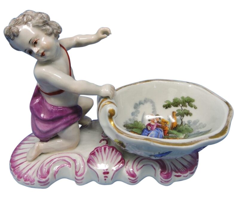 Meissen Germany Porcelain Figurine of Boy with Decorated Shell-Shaped Dish of Courtiers