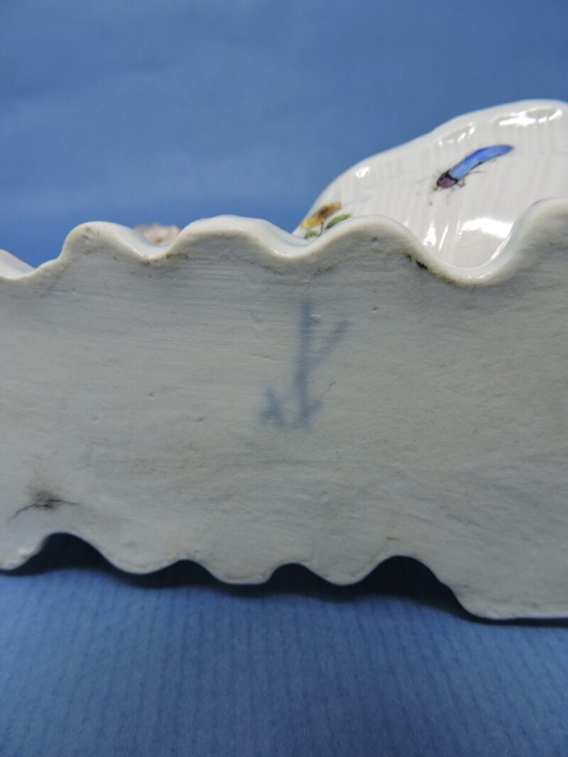 v** SOLD ARCHIVES **vA wonderful Meissen Germany porcelain figurine of a young boy kneeling beside and holding the rim of a shell-shaped dish, decorated on the exterior with flowers and bugs and showing a courtier scene on the interior. The dish has gold accents and a gold painted rim.