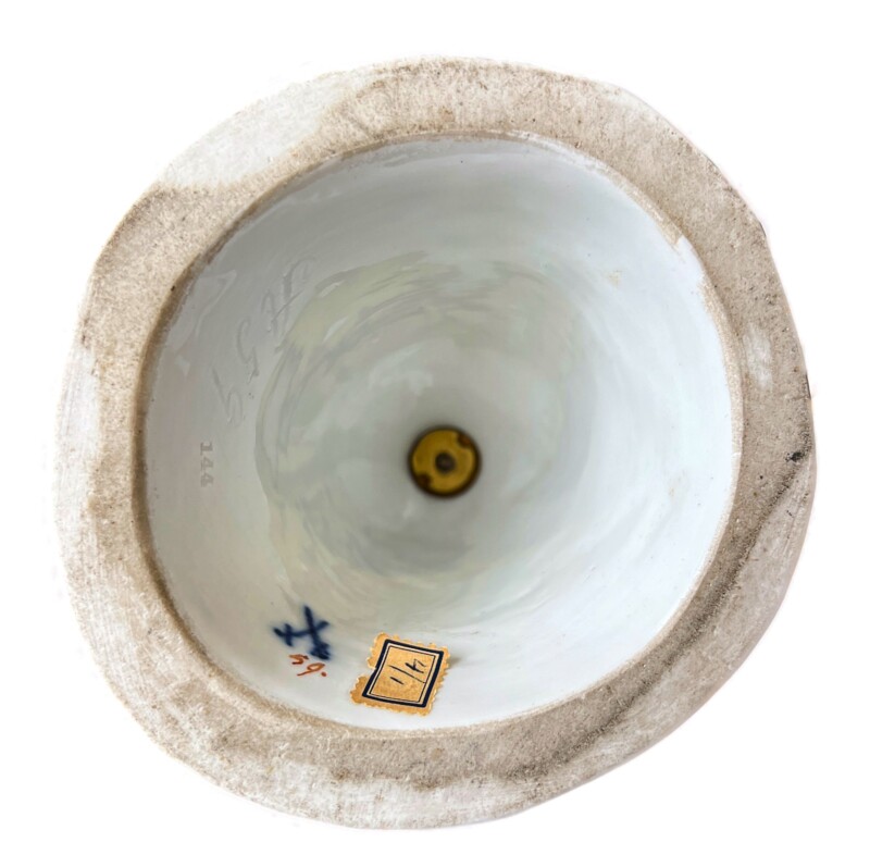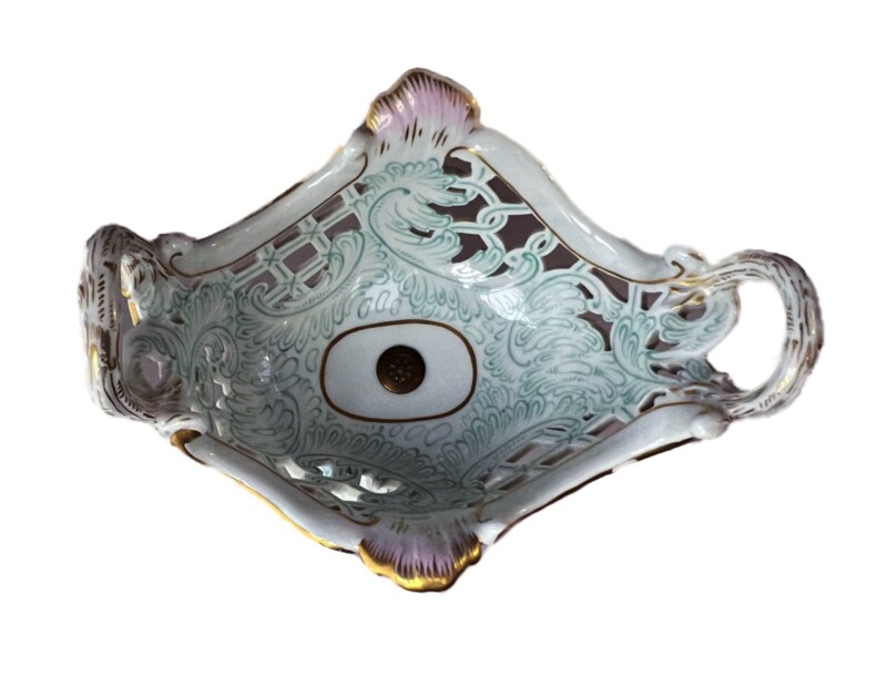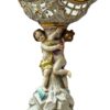 Gorgeous centrepiece in the round, late 19th Century, Meissen “blue crossed swords” mark, delicately modelled and hand-painted in soft organic pastels. Two putti play “chase” about the stem, suspending a reticulated basket.  The two-handled rocaille-molded pierced basket has a lovely hand painted interior with a pastel linear foliage design mirroring the exterior theme .