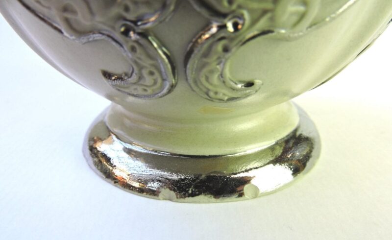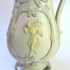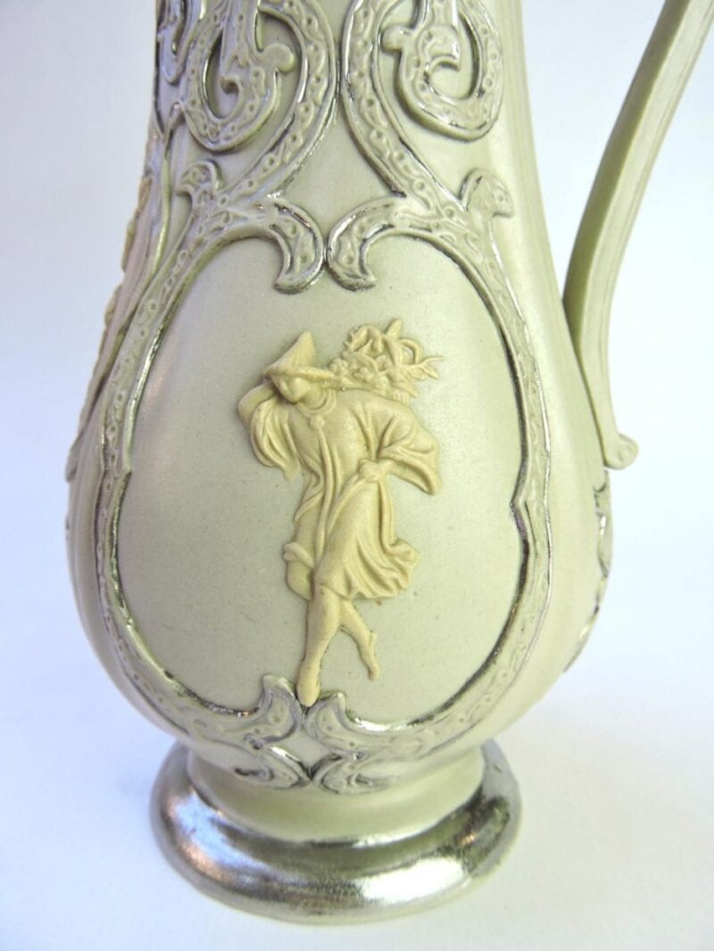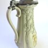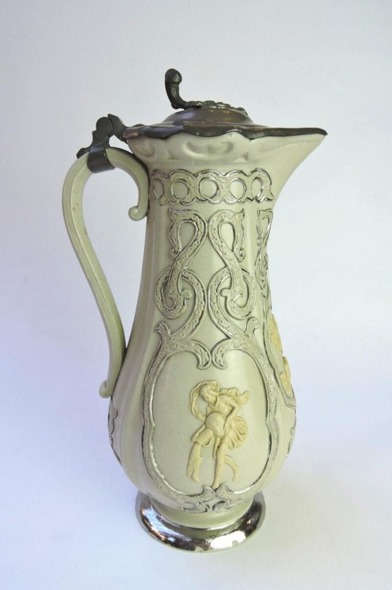 PotteryA lovely Mettlach Germany salt glaze stoneware ewer with silver accents, circa 1880-1895, celebrating the harvest. It shows a figure pouring water and another figure carrying the harvest, with applied flowers under the spout.