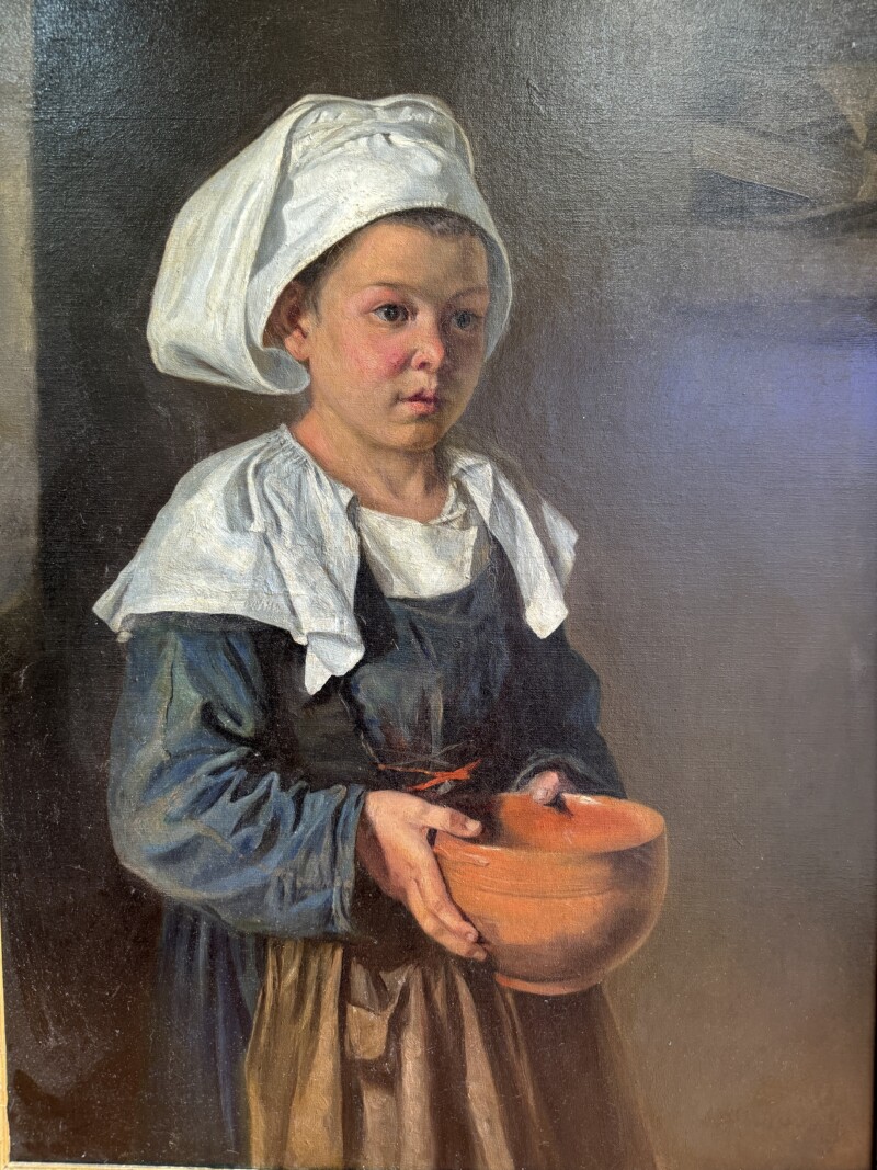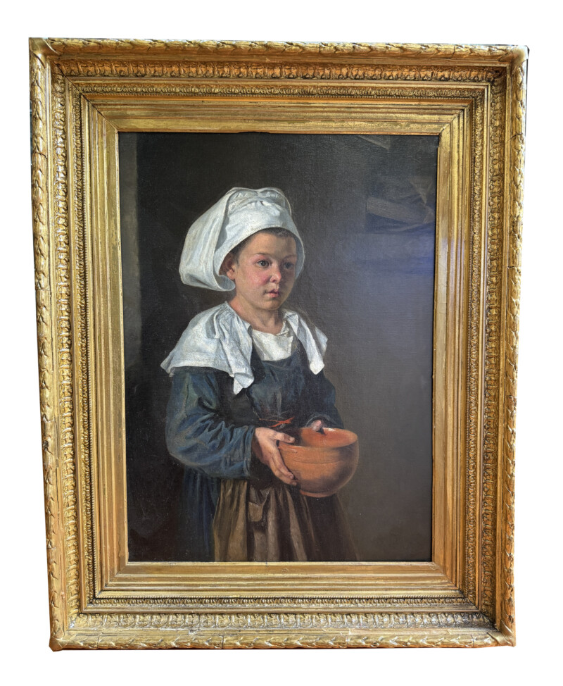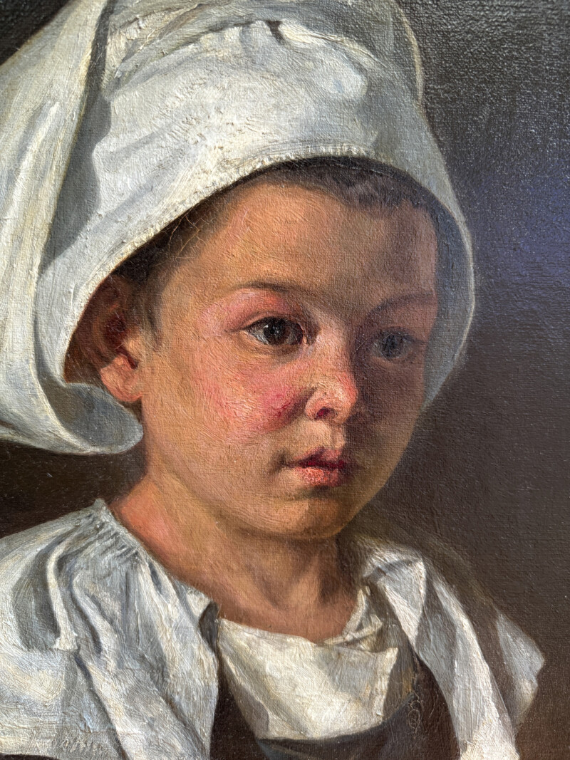 A beautifully rendered portrait of a Breton girl in the style and theme of the famous painter Robert Wylie (1839-1877). This large work is technically wonderful in its sophisticated colour and the immediacy of the detailed brushwork. Although unsigned, the subject matter, location and time period is consistent with the style of Robert Wylie who painted exclusively in Brittany, for most of his life.