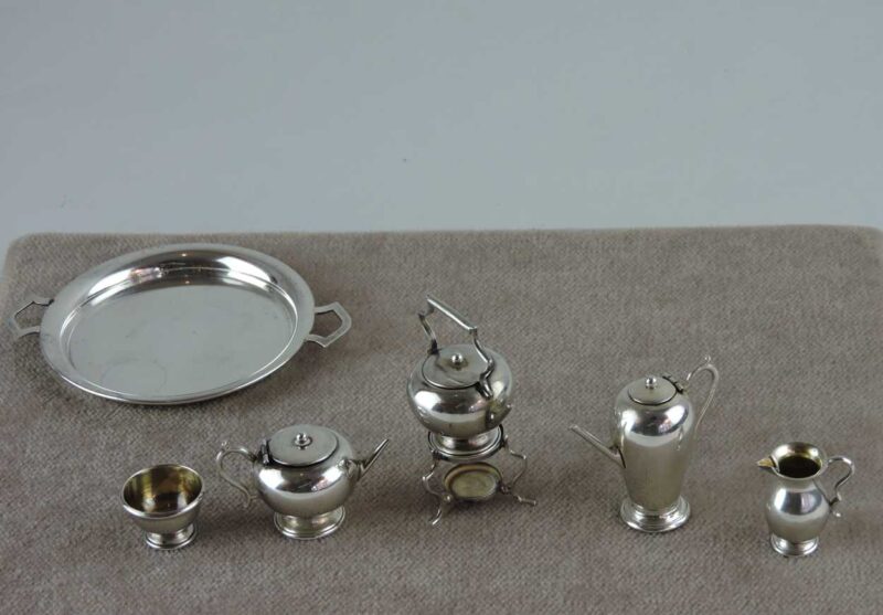 The miniature tea set consists of 1 creamer, 1 coffee pot, 1 tea pot, 1 sugar bowl, 1 kettle with stand, and 1 serving tray.