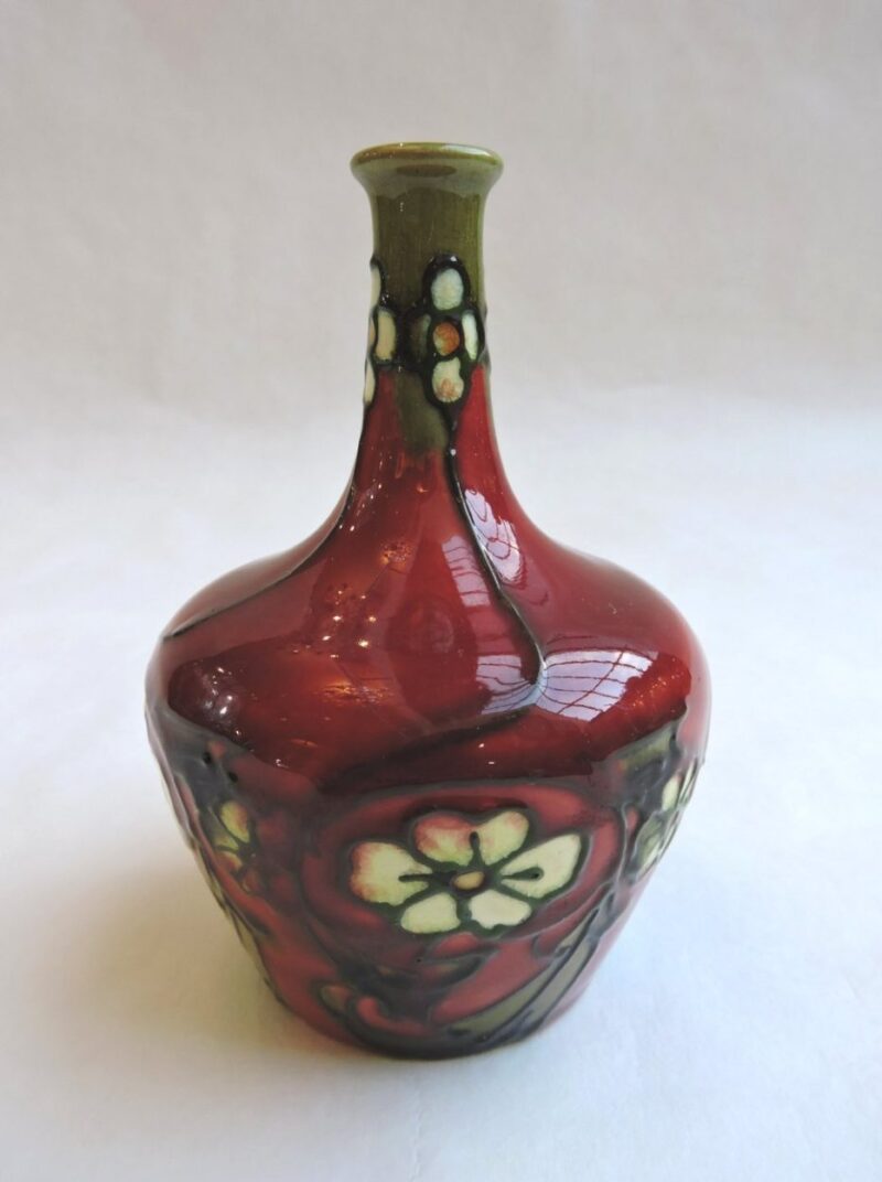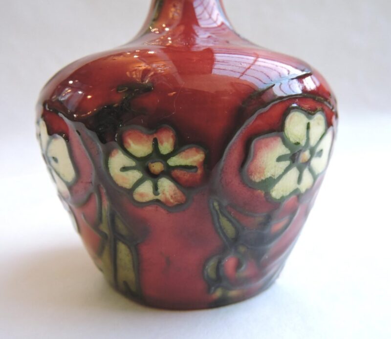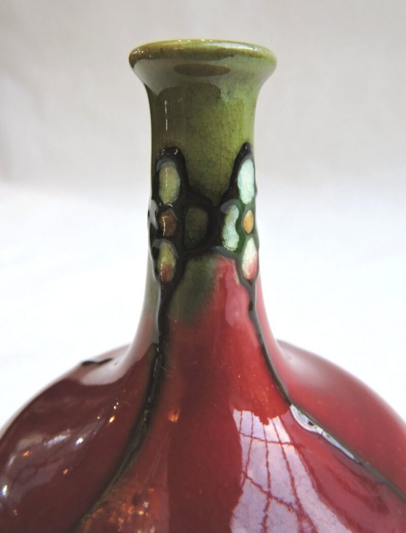 A rare Minton Ltd.  Secessionist movement pottery vase in deep bright reds with yellow lowers and green leaves.