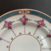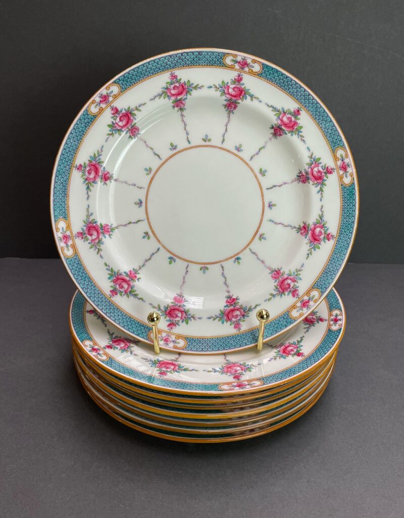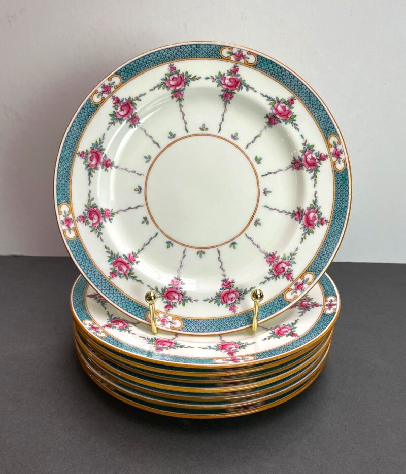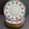 8 Mintons luncheon plates in the Persian Rose pattern,  a pattern that includes a blue rim with a lovely pink rose pattern that really stands out.
