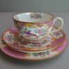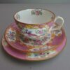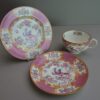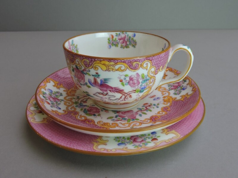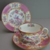A trio set in the “Pink Cockatrice” pattern by Mintons consisting of a cup, saucer and small plate.