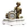 A gilt bronze clock on white marble base.  The round white enamelled clock face surrounded by gilt bronze and then white marble with a gilt bronze figure of a putti wrapped in neoclassical dress on one side of the clock and a head on plinth on the other side.  The putti has a book in hand with pen and there are books on the floor beside.  The marble base is serpentine in shape and has a repair to one pointed corner.  Pendulum and key included.