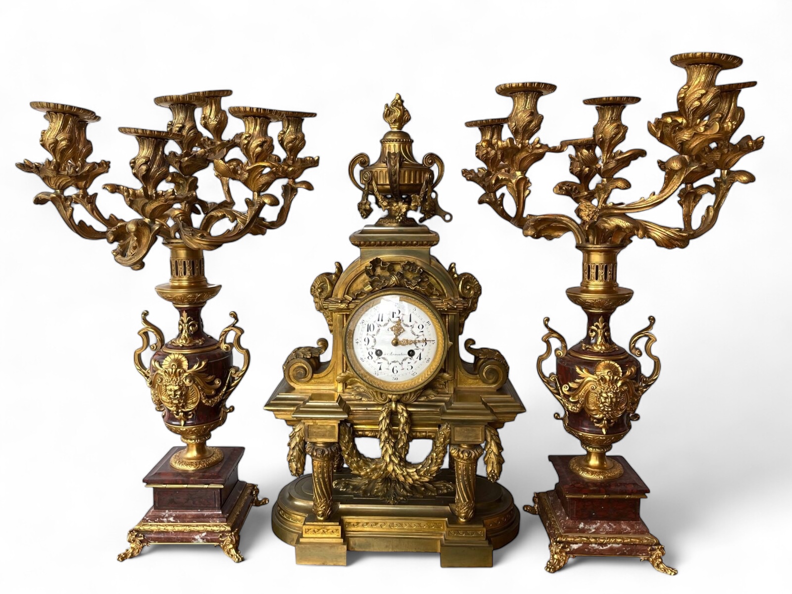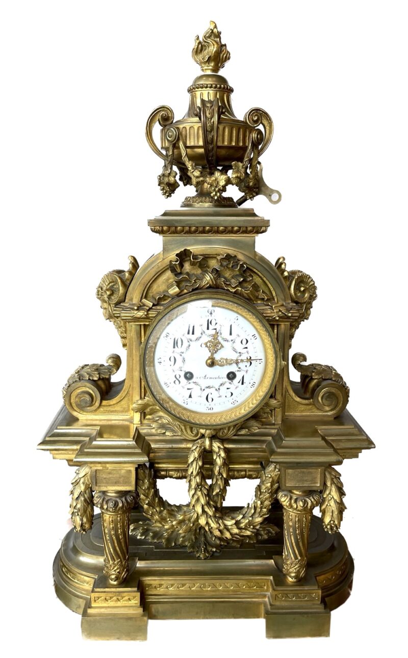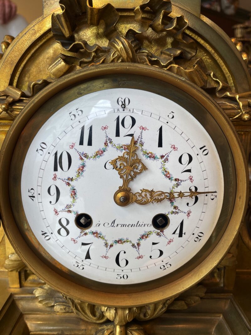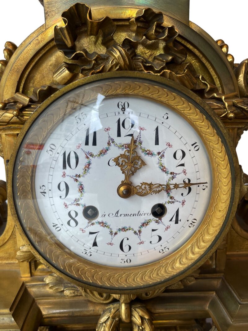 GeneralAn exceptional 3-piece French gilt bronze garniture clock set of impressive scale and craftsmanship. The clock is richly cast in bronze, featuring elegant laurel swags across the front, classical Louis XVI-style pillars, and a flambeau urn finial crowning the top. The white enamel dial is delicately painted with colourful floral swags and bold black numerals, and is signed “à Armentières.”