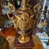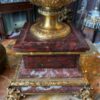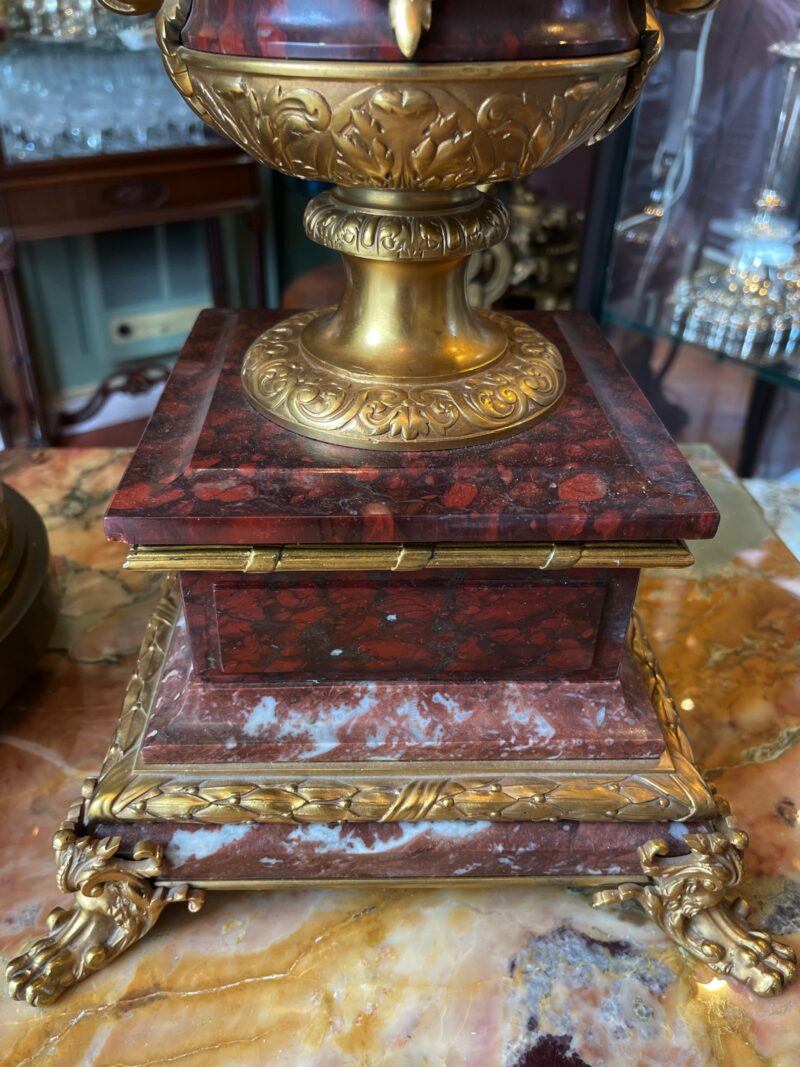 The accompanying candelabras are grand and ornate, each with a heavy rouge marble base and body, adorned with finely detailed gilt bronze mounts. These striking pieces are not only decorative but of substantial weight and superb quality.