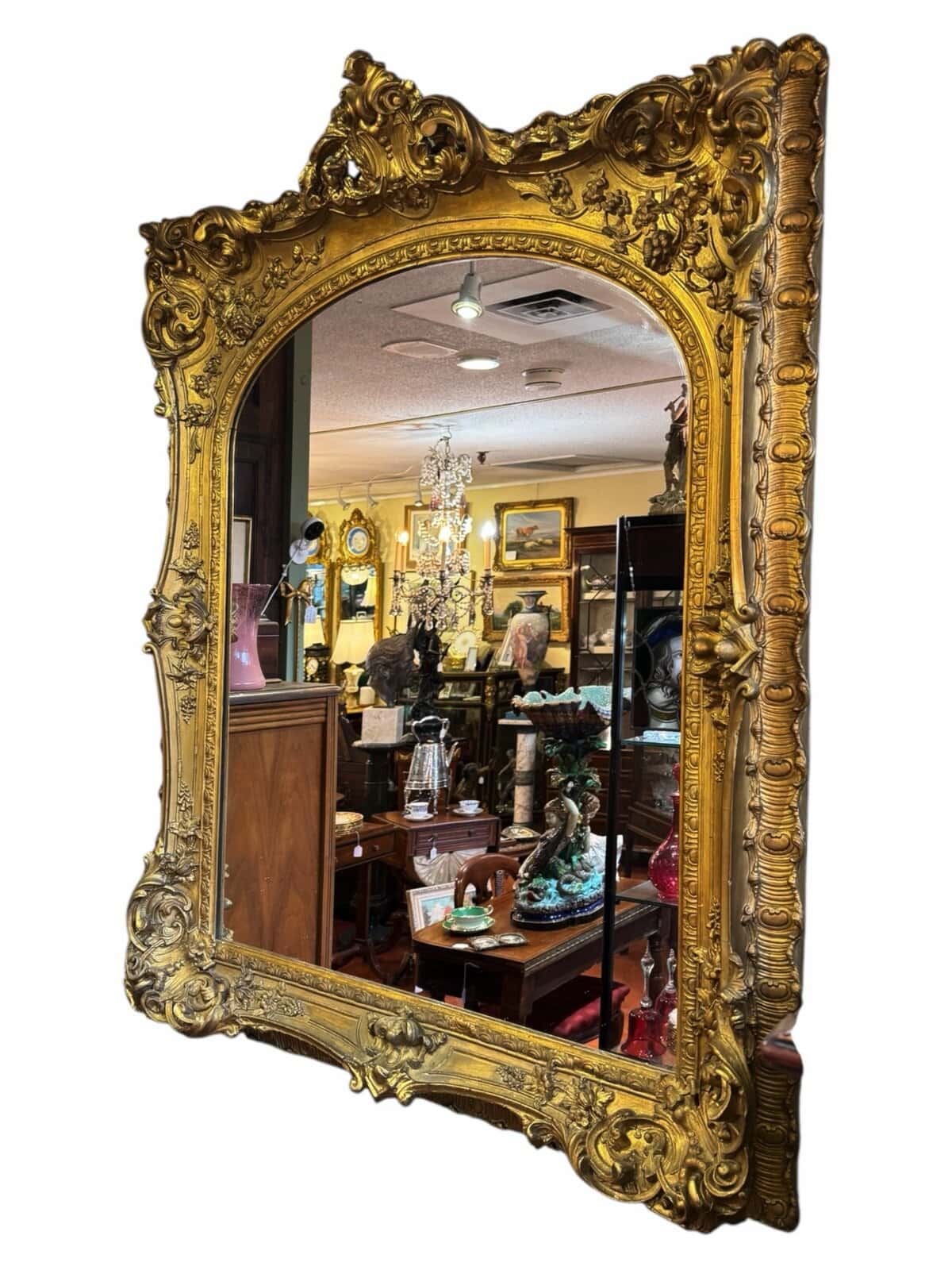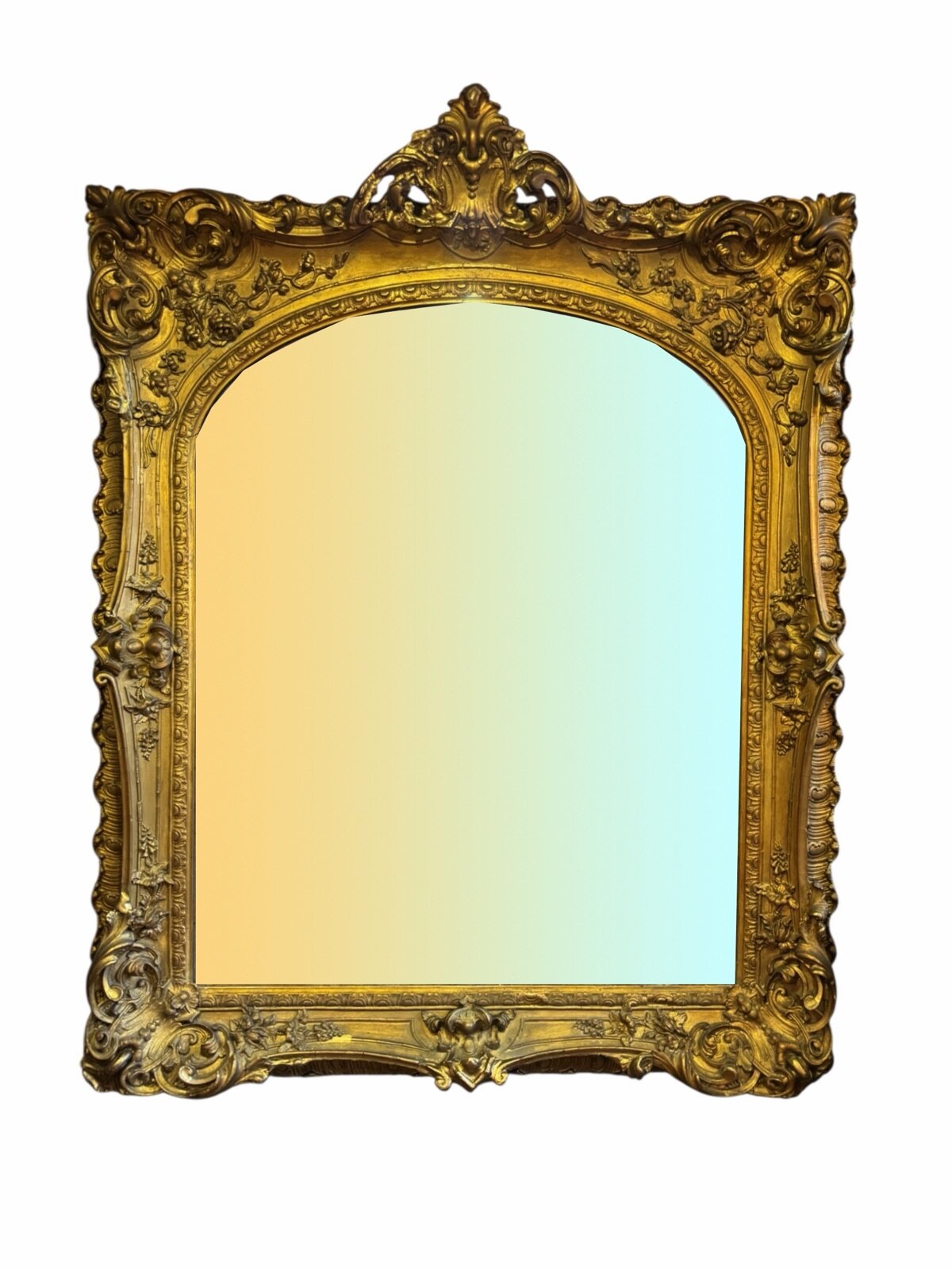 Monumental & Lavish Second Empire French Louis XV Style Giltwood Mirror, Napoleon III Rococo Revival, Mid 19th Century, 48″ Tall