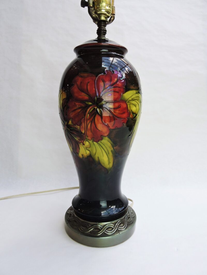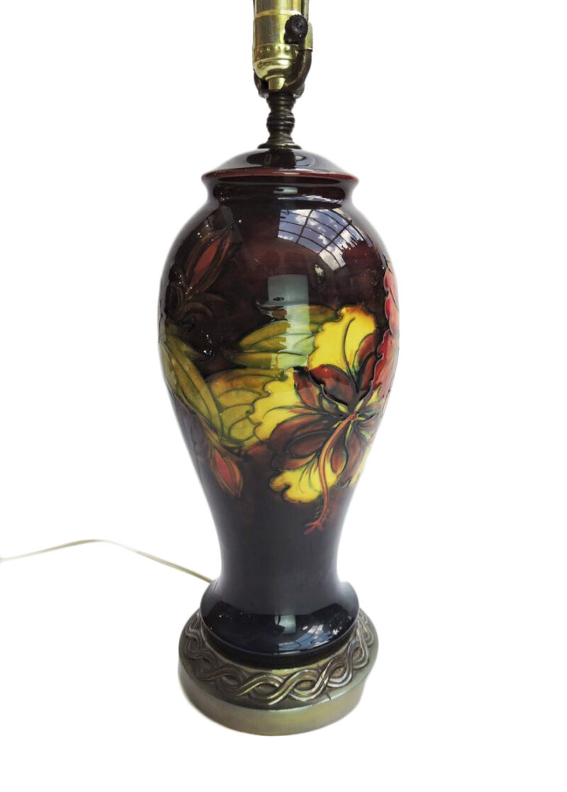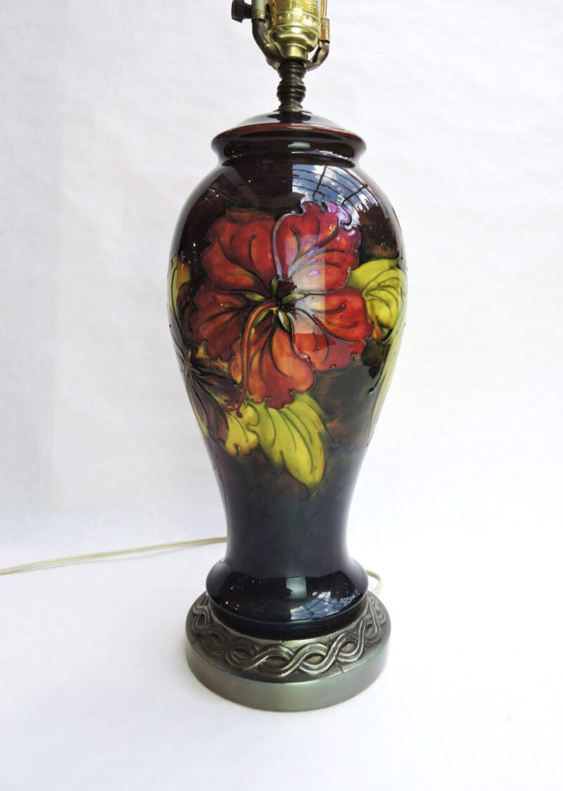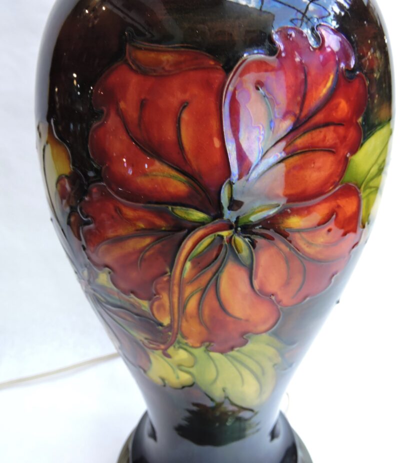 Lighting, PotteryA Moorcroft Flambé glaze pottery lamp in the Hibiscus pattern in good working order. The flambé brings out bright colours in the Hibiscus pattern with large red, purple, and yellow flowers with orange buds and green leaves over a deep red background. This pattern was one of Walter Moorcroft’s designs and dates mid 1940’s to early 1950’s. The flambé glaze was always more difficult to produce as they had to fire it at intense heat that would often break the pottery – so the flambé is more rare.